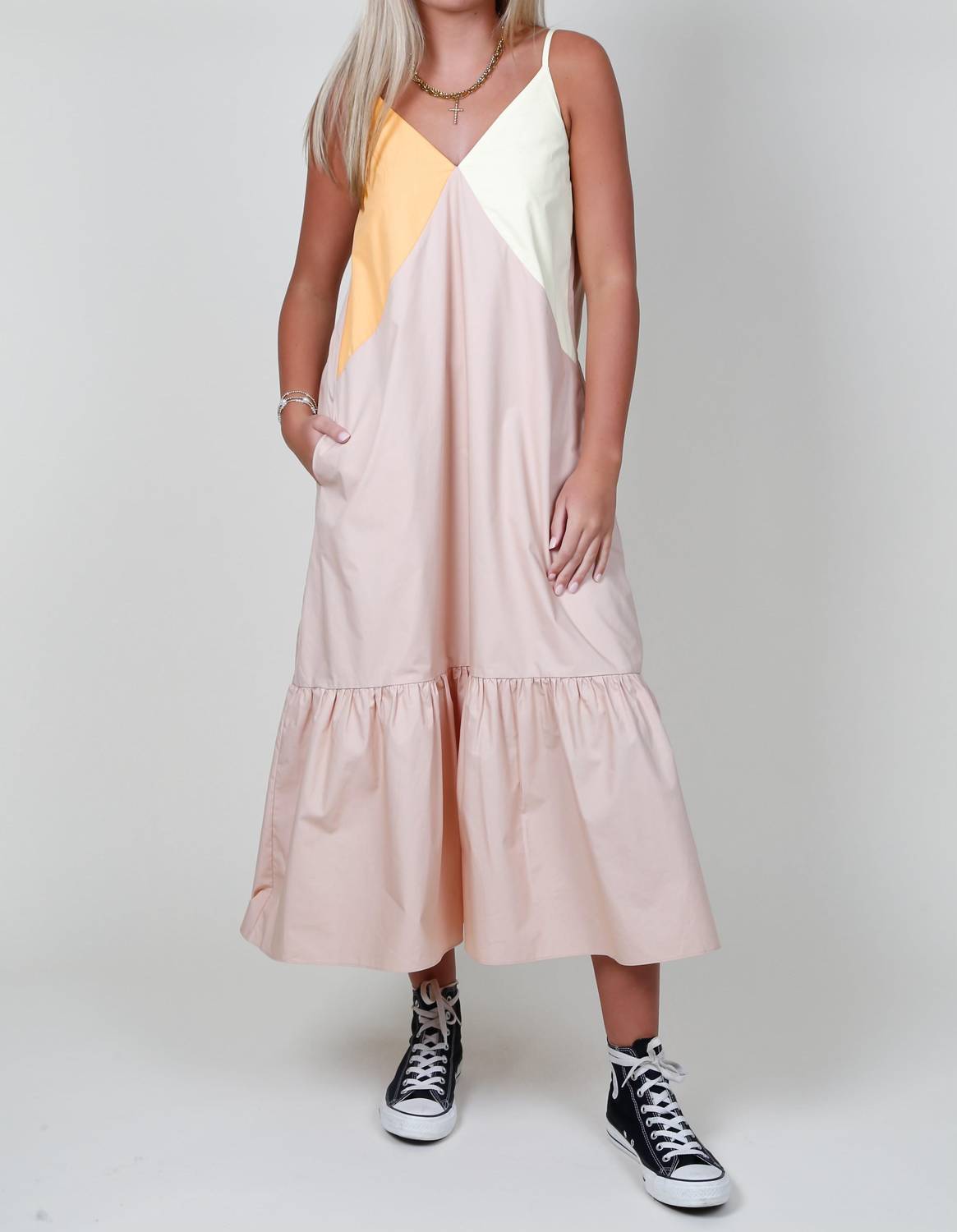 A maxi dress that is just as cute as it is comfortable. Introducing the Colorblock Maxi Dress by English Factory, a vibrant choice for a stylish summer day. This maxi dress features adjustable spaghetti straps and a deep V-neckline, offering both comfort and allure. Made from 100% cotton, it comes with side pockets and a back elastic for a relaxed fit. Closure: Pull on. Care: Hand wash cold, do not bleach, do not tumble dry, iron low. Perfect for beach days and Mother’s Day celebrations.