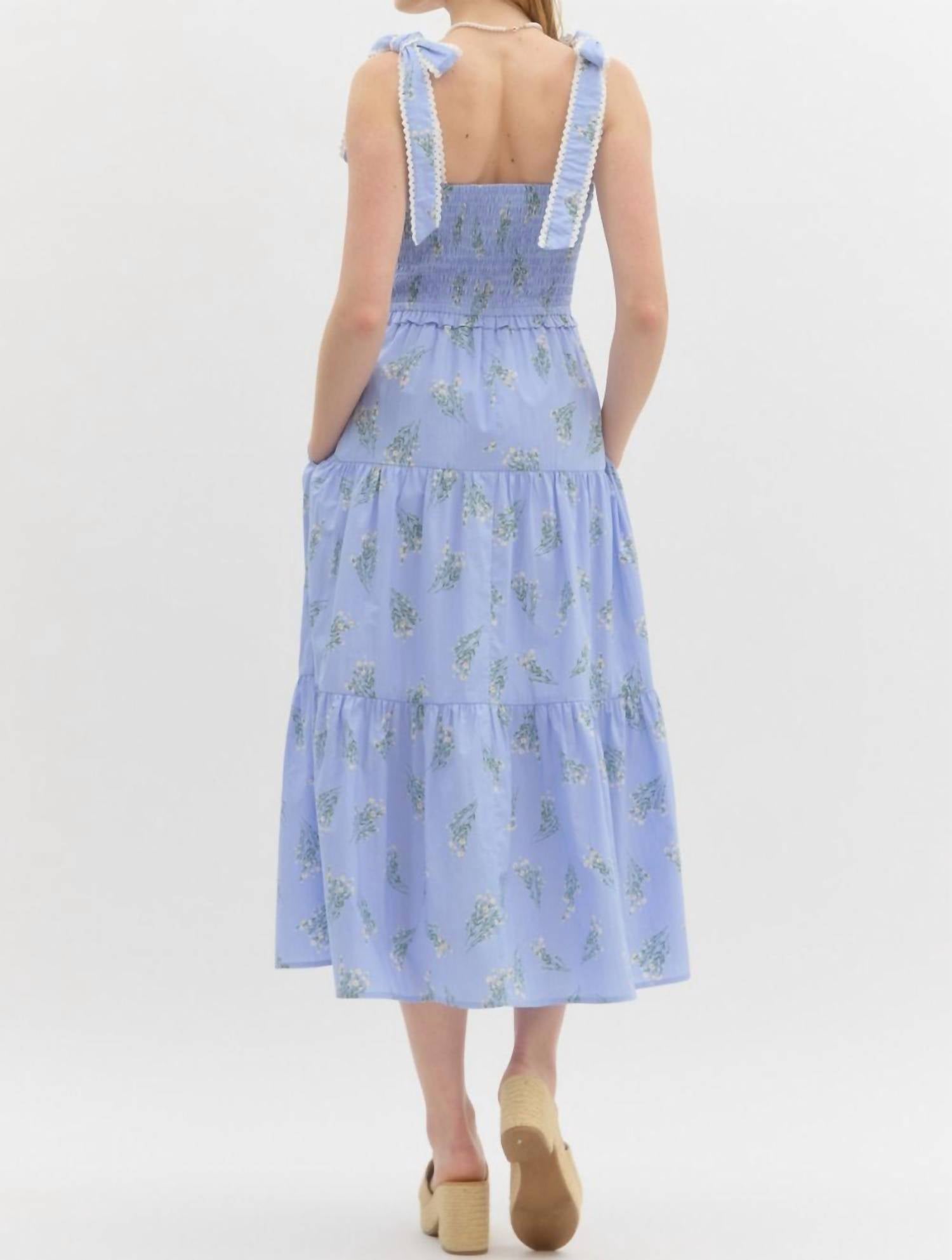 The perfect length dress does exist. Elevate your summer wardrobe with the Amelia Midi Dress by Entro, perfect for any boho chic occasion. This sleeveless, light blue dress is crafted from 100% cotton, featuring a straight, tiered A-line silhouette adorned with a floral print. It boasts shoulder ties for an elegant touch, complemented by an elasticated smocking top panel for comfort, and convenient side pockets. Closure: Tie closure. Care: Machine wash. Ideal for Thanksgiving or a dinner party, this woven, non-sheer dress combines style and practicality effortlessly.
