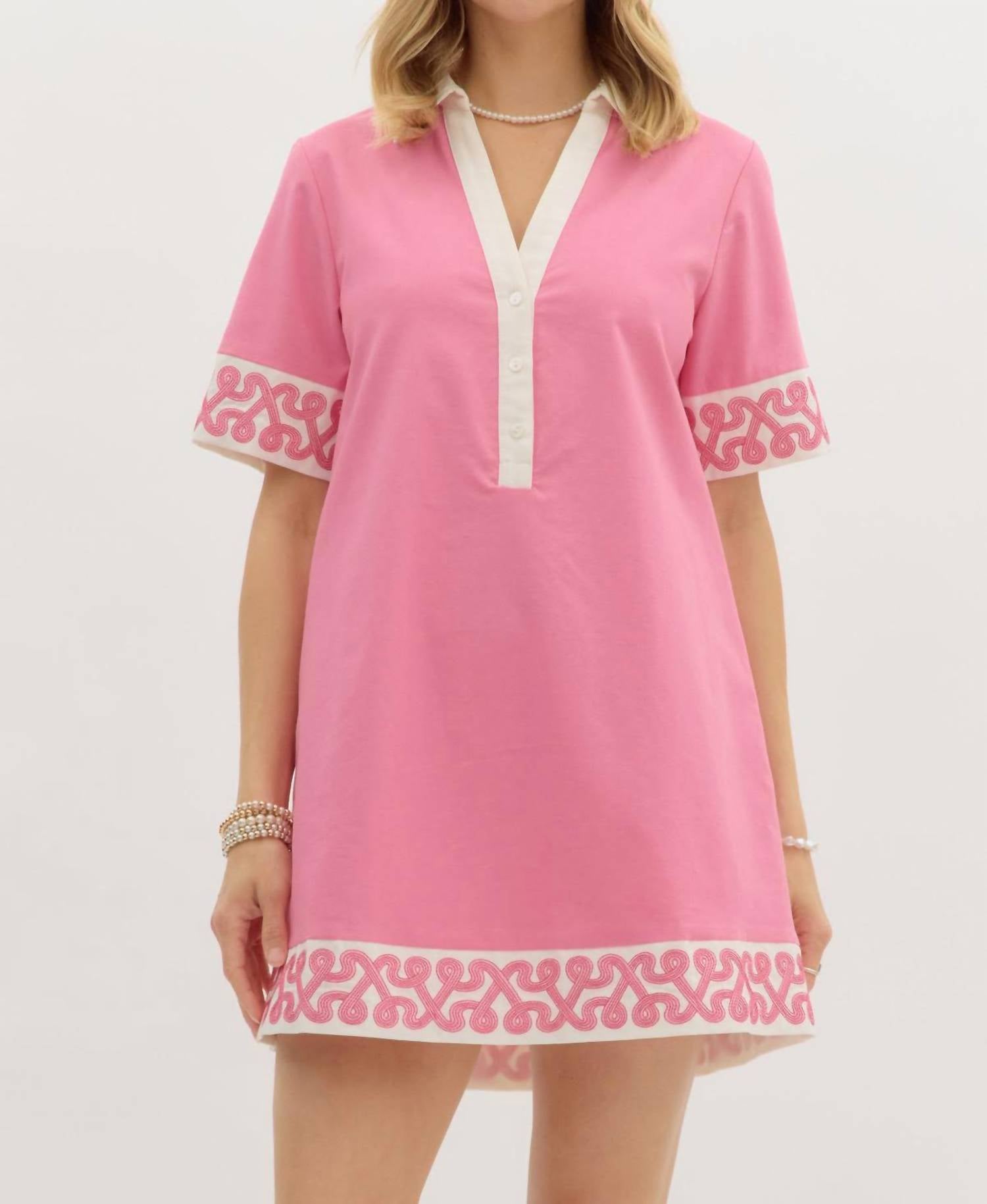 The perfect mini dress for those warmer months. Meet the Collared Mini Dress by Entro, the perfect blend of boho chic and modern elegance in a delightful pink and cream palette. This women's shift dress features short sleeves and a stylish collar, adorned with accenting details on the sleeves and bottom hem. Boasting a solid pattern, it is designed for a flattering silhouette with a convenient button closure. Care instructions suggest a machine wash for ease of maintenance, making it an ideal choice for your summer wardrobe.