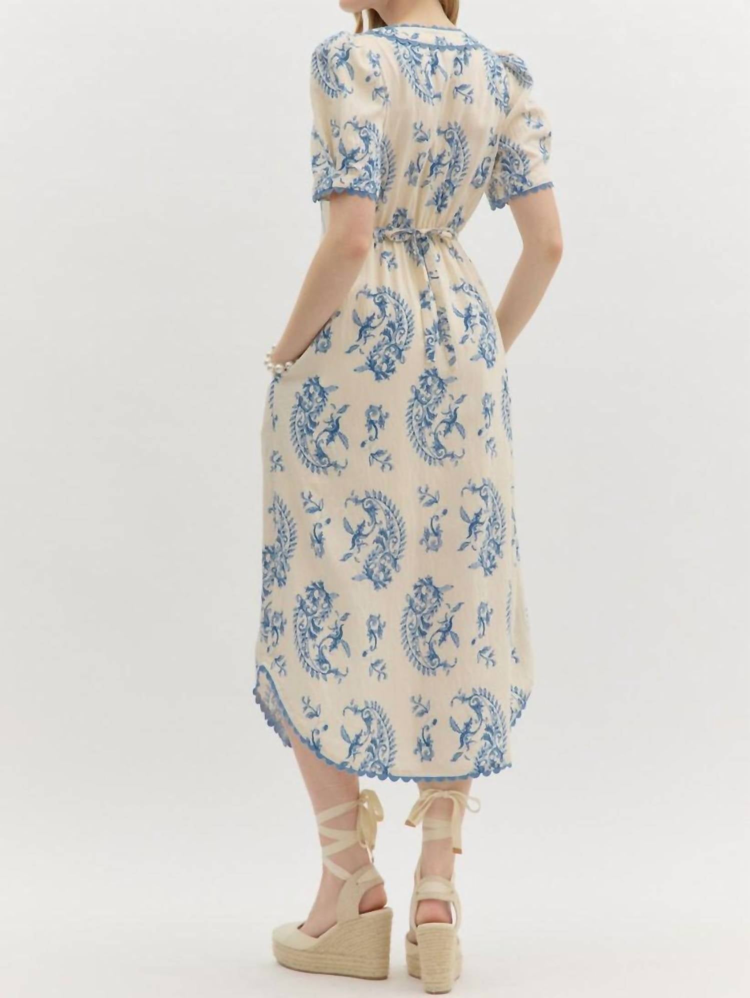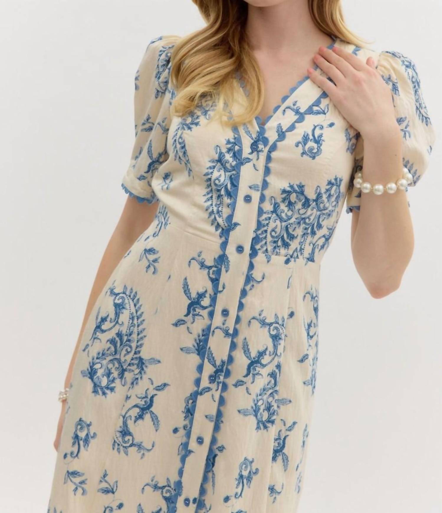 Style this maxi with your favorite statement necklace and sandals for the perfect look. The Blue Ivory Damask Midi Dress by Entro is a stunning choice for any occasion. Featuring short puff sleeves and an elegant paisley print, this A-line dress is crafted from a composition of 80% Rayon and 20% Nylon. The dress showcases a v-neckline with an open styling and a front button placket adorned with detailed trim. Machine wash and tumble dry for easy maintenance.