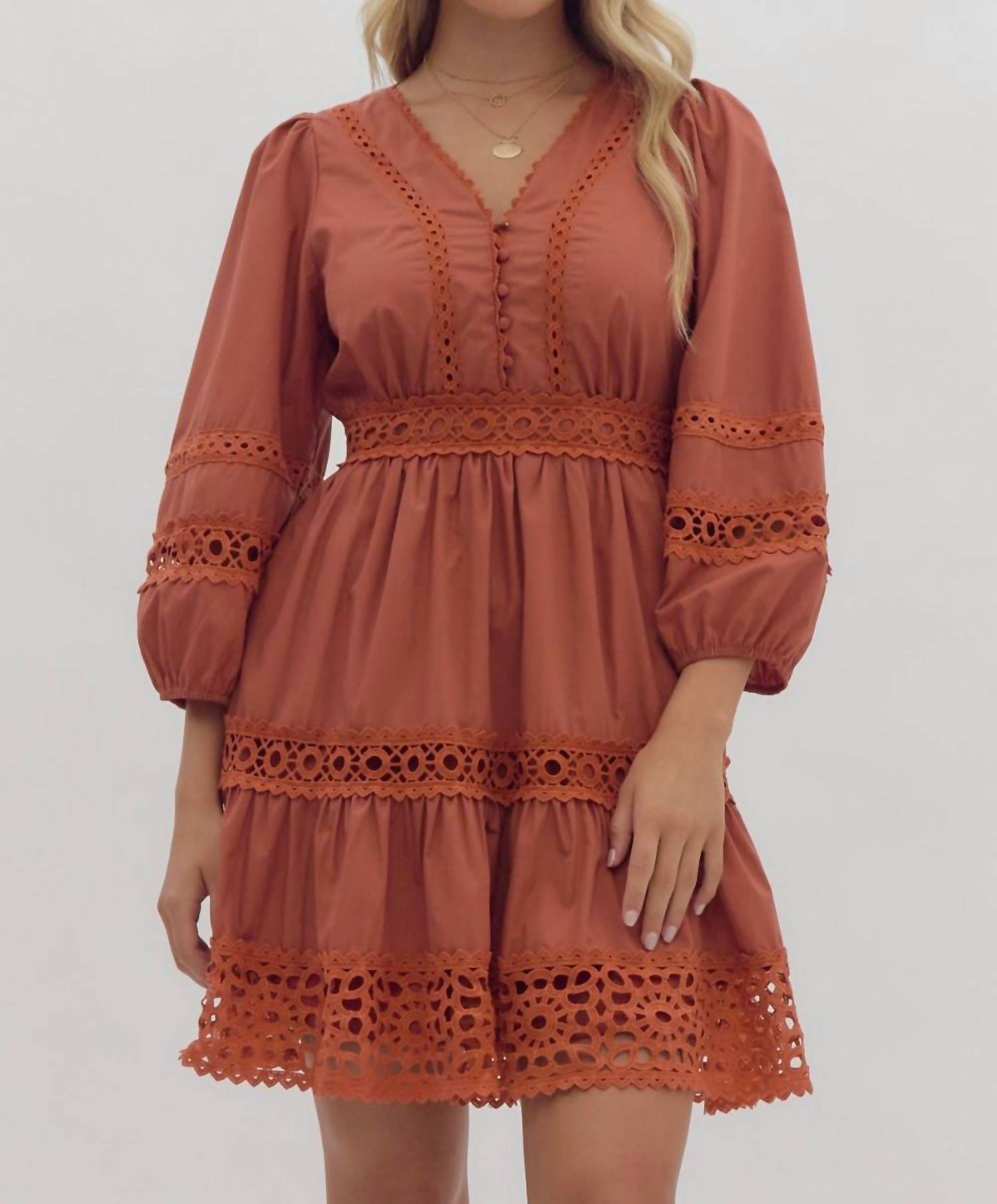 The perfect mini dress for those warmer months. Introducing the Entro Rust Lace Inset Smocked Waist Short Dress, an elegant piece perfect for your holiday gatherings. With its three-quarter sleeves featuring lace trim and a flattering A-line silhouette, this dress is crafted from 100% Cotton and offers a lightweight, non-sheer feel. Designed with a V-neckline and 5 covered buttons, it boasts an elastic lace waistband and lace inset details for added charm. It includes a full short skirt with lace trim hem and offers a pull-on closure for ease.