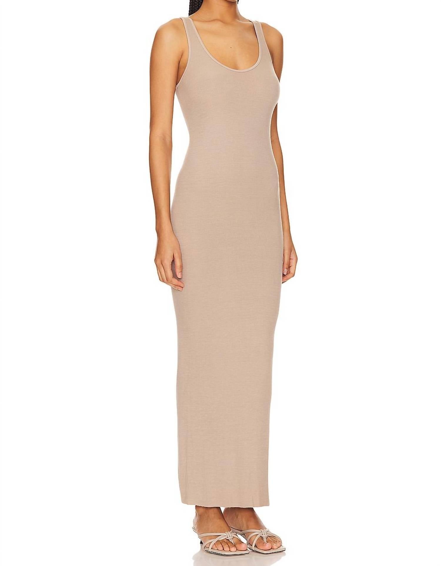 A maxi dress that is just as cute as it is comfortable. Introducing the Silk Rib Tank Maxi Dress by Enza Costa, a stunning blend of luxury and comfort with a sleeveless design that highlights a body-hugging fit. Crafted from 87% viscose, 10% silk, and 3% lycra, this maxi dress offers a flattering stretch and features the brand's signature center back seam. Originating from the USA, this pullover style ensures effortless wear, and its tan solid color is perfect for any occasion, including Thanksgiving. Care for it is simple with machine wash instructions.