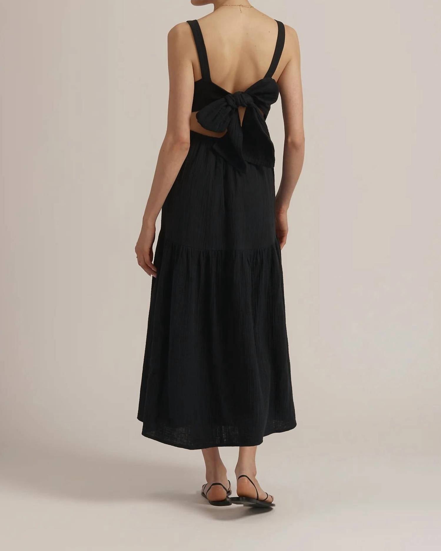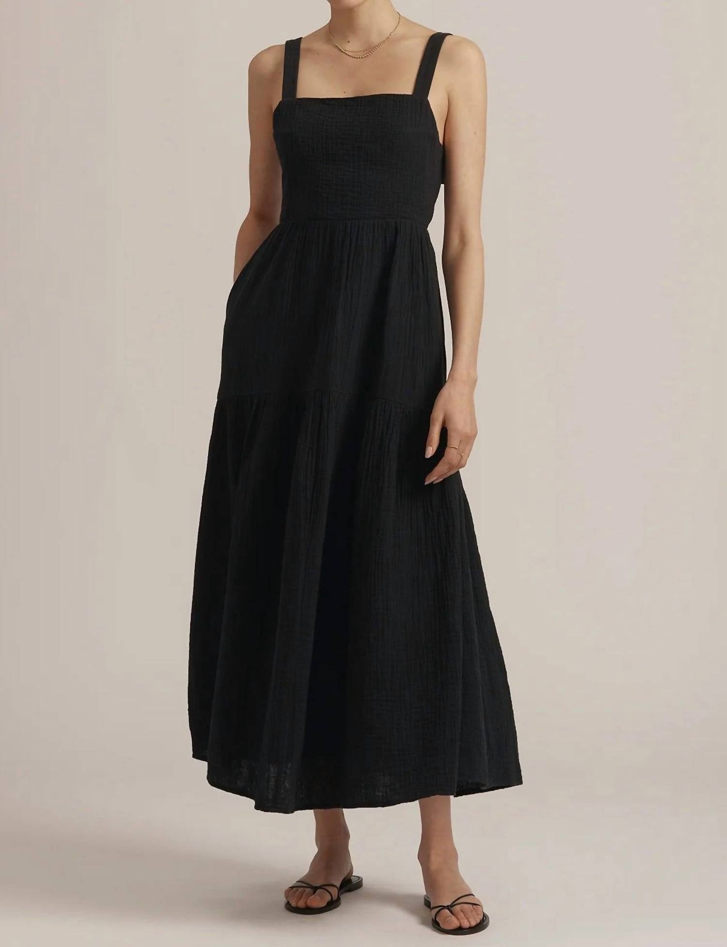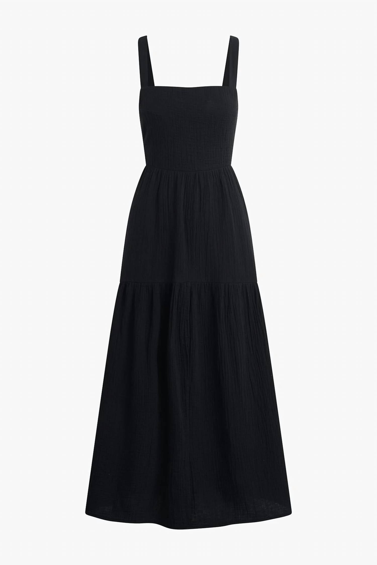 The Go To Dress by Favorite Daughter is the ultimate summer staple, crafted from 100% organic cotton for an airy feel and effortless style. This sleek black maxi dress features a flattering square neckline with tank straps and a flowy tiered skirt, complete with convenient side seam pockets. Its 52" A-line silhouette and back tie closure accentuate any vacation-ready look. Care instructions are simple, with a machine wash recommended to maintain its minimalist charm.
