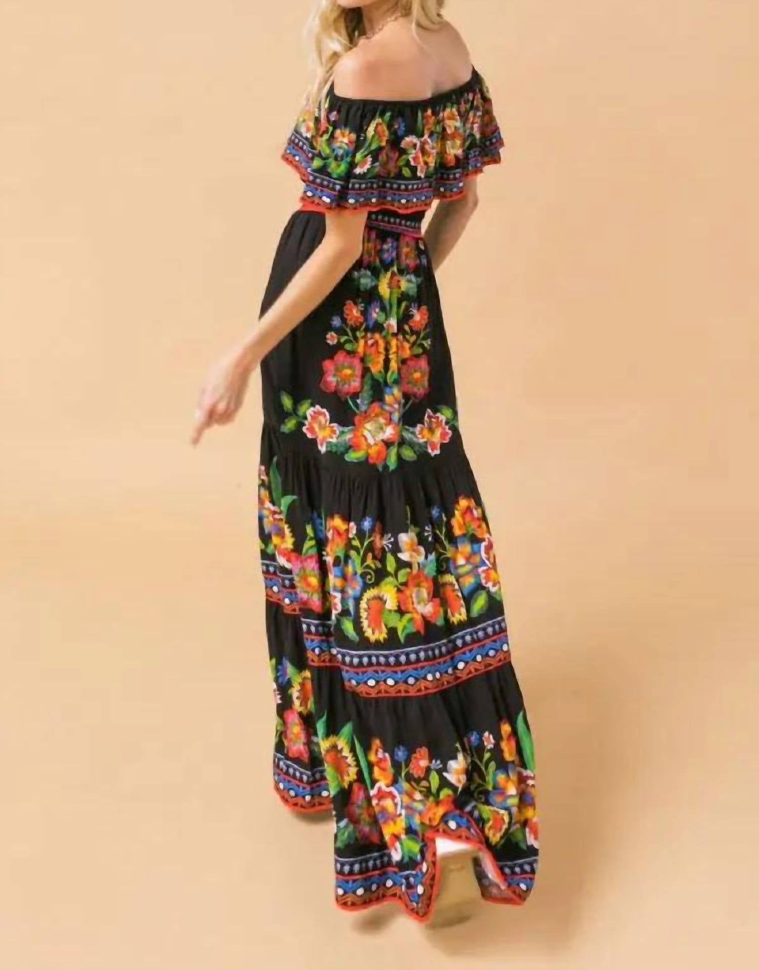 Who doesn't love a good maxi dress? This one you'll be reaching for season after season. Embrace your boho chic style with the Midnight Garden Maxi Dress by FLYING TOMATO. This striking floral dress features a strapless, off-the-shoulder neckline and an elasticized waist, complemented by a self sash belt and a tiered A-line silhouette. Crafted from 100% polyester, this maxi-length piece measures approximately 53 inches and is imported. Perfect for music festivals or Cinco De Mayo celebrations, channel your inner free spirit with this summer statement piece.