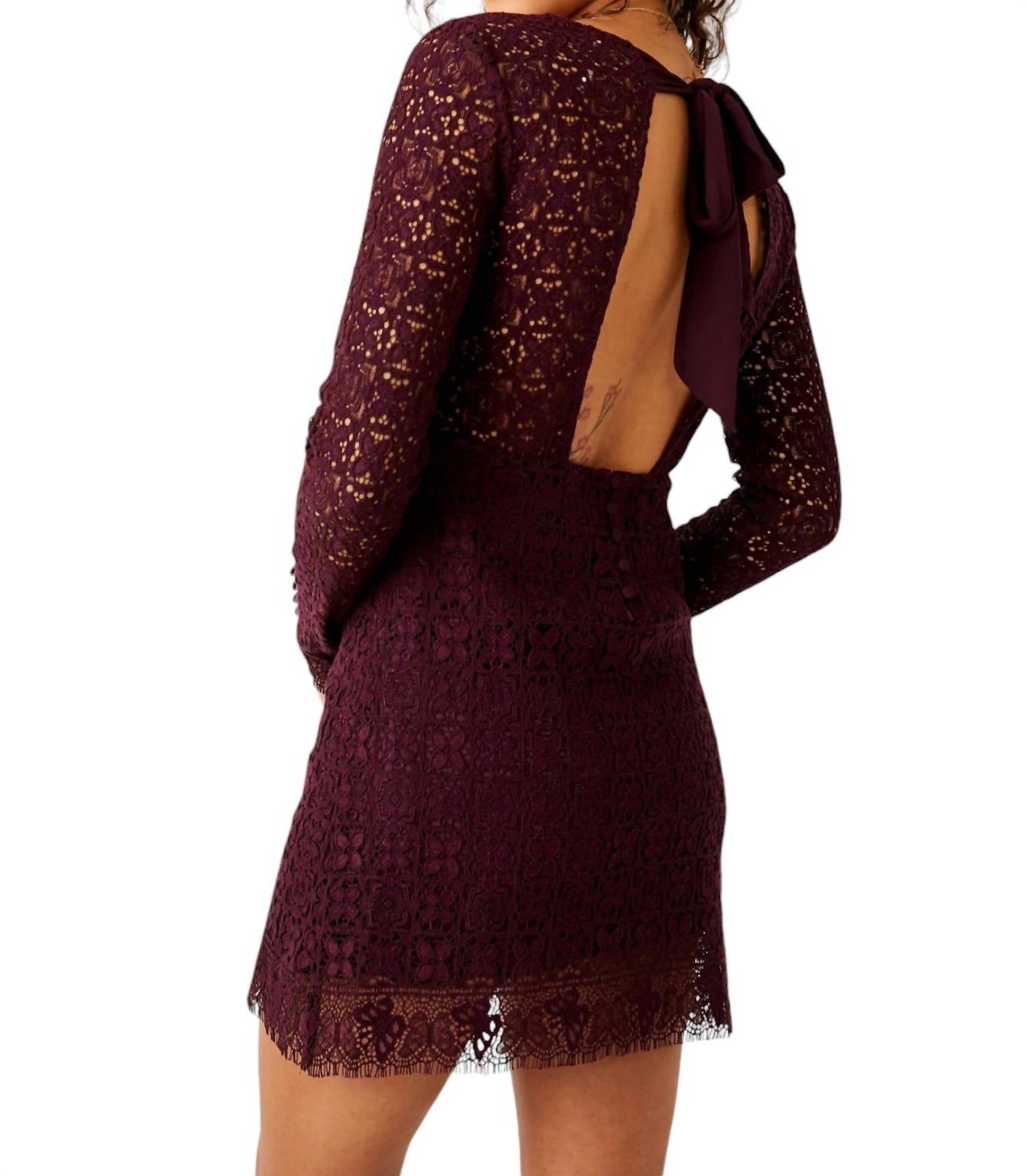 This gorgeous lace long-sleeve minidress features an open back cutout highlighted by a bow tie closure. It has a V-neck, long sleeves, and is partially lined. Made of 68% nylon and 32% polyester. Length: 32" (size 8). Hand wash. Imported.