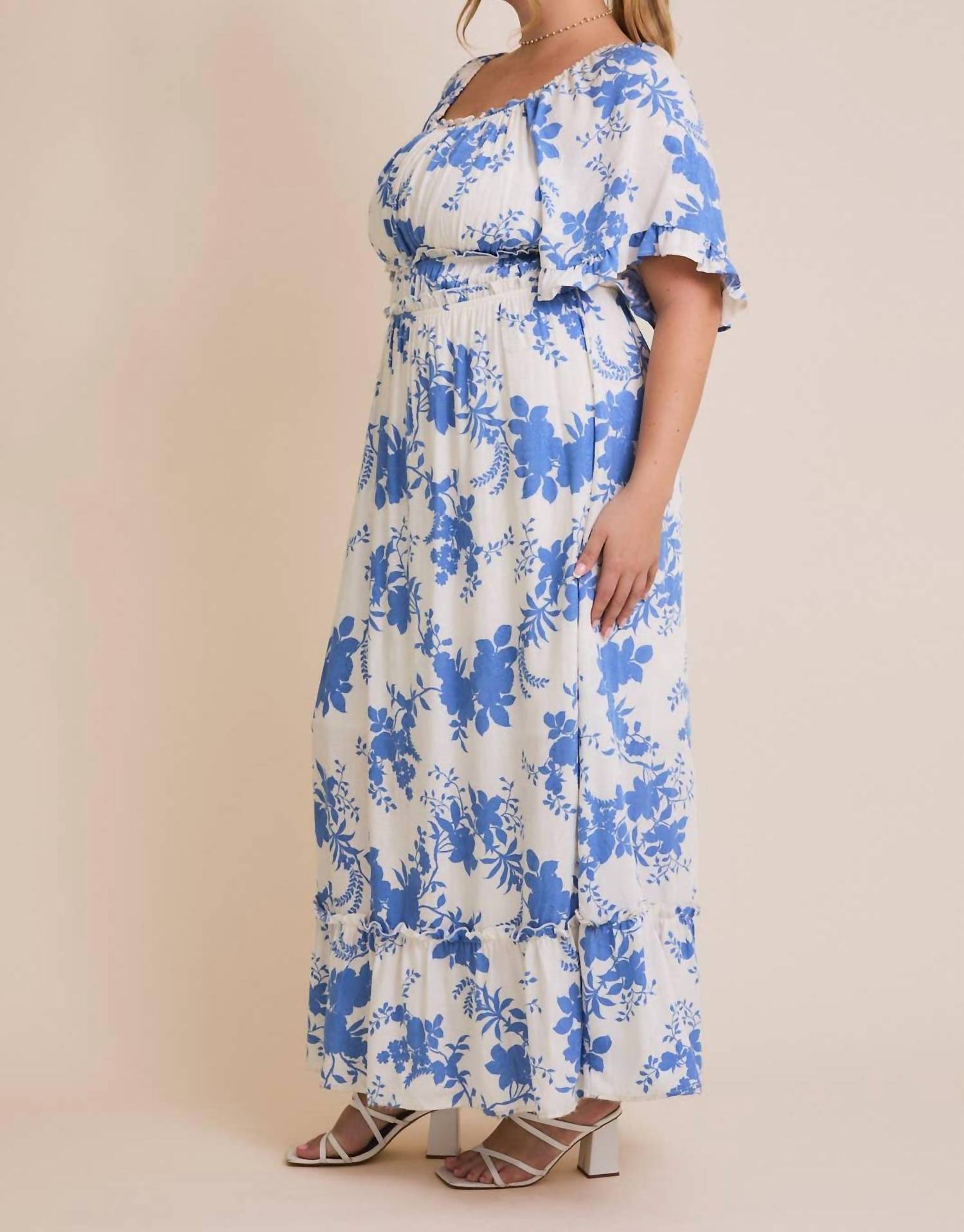 Pair with your favorite sandals for an effortlessly chic look. Step into summer with the Indigo Bloom Maxi Dress by GILLI, crafted for comfort and style in an uplifting white and blue floral pattern. This casual dress features short sleeves and a squareneck, complemented by an elastic waist that accentuates the plus-size silhouette. With a convenient pull-on closure, it's a breeze to wear, making it an effortless choice for vacations and summer occasions. Care is simple too—just machine wash this boho-chic piece and you'll be ready to embrace every sunny day with confidence.