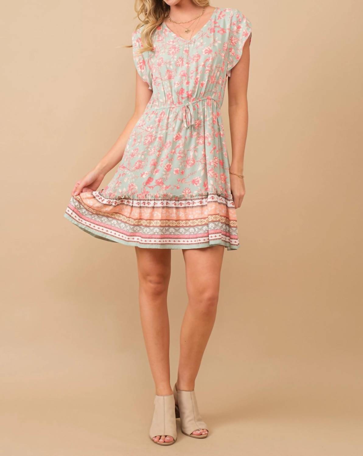 Elevate your spring wardrobe with the Floral Border Print V-neck Dress by Hayden LA, showcased in a charming sage hue. This feminine piece features a cap sleeve design with an elastic waistband and a fixed waist tie for a flattering fit. Crafted from 100% Rayon, it includes side seam pockets for added convenience. With a pull-on closure, it's easy to wear, and for care, hand wash and line dry. Model is 5'10" with measurements 32-24-38, wearing a size small. Perfect for a vacation-ready look with its patterned aesthetic and A-line silhouette.