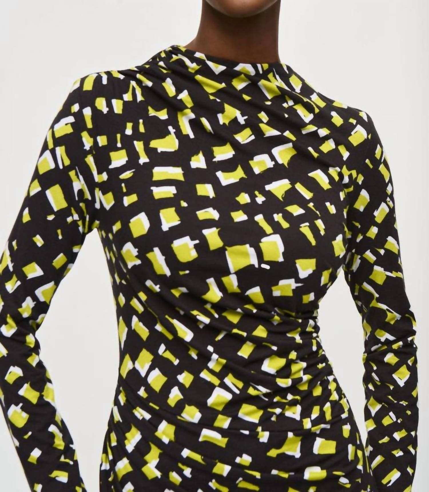 A midi dress so versatile, your options for wearing it are endless. Discover the Abstract Print Midi Sheath Dress by Joseph Ribkoff, a statement piece crafted in Canada from a comfortable viscose blend. This graphic print dress features long sleeves and a chic mock neckline, with a versatile asymmetric hem that falls past the knees. It includes a practical back zipper closure and is designed without pockets for a streamlined silhouette. Care: Hand wash in cold water, lay flat to dry in the shade, and refrain from ironing or dry cleaning.