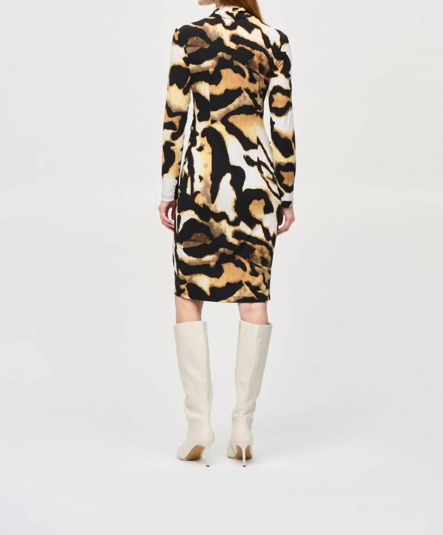 A midi dress so versatile, your options for wearing it are endless. Elevate your wardrobe with the Joseph Ribkoff Animal Print Faux Wrap Sheath Dress in an eye-catching off-white and multi-pattern. This elegant dress features long sleeves and a v-neckline, creating a sophisticated look that's perfect for any occasion. Made from a blend of 95% Polyester and 5% Spandex, the knee-length sheath design ensures a flattering fit. Crafted in Canada and designed for comfort with a pullover closure, it requires hand washing, laying flat to dry in the shade, and should not be ironed or tumble dried.