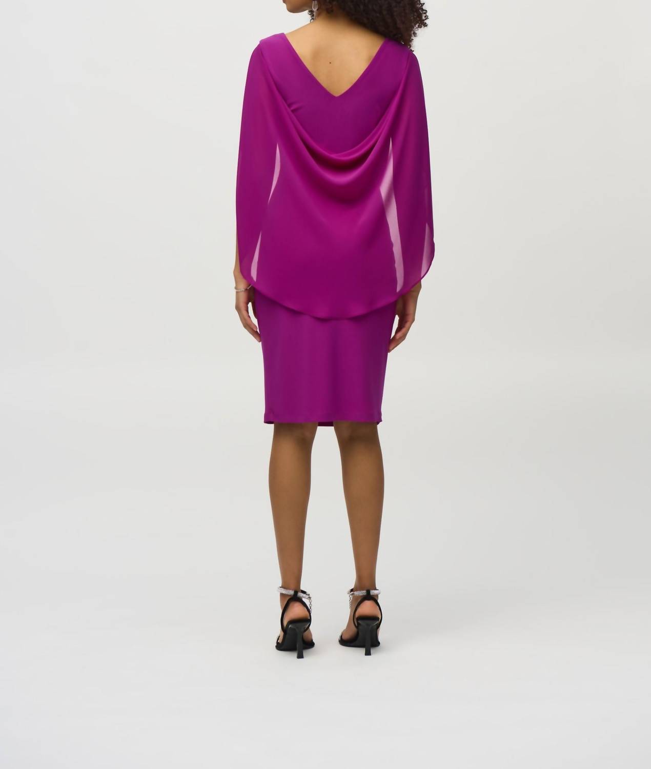 The kind of easy and flattering dress you'll be reaching for all season long. Step into elegance with the Joseph Ribkoff Chiffon Overlay V-neck Sheath Dress in stunning Empress Violet. This chic piece features three-quarter cape sleeves and a flattering v-neckline, crafted from 100% polyester for a silky finish. With a stylish knee-length and sheath silhouette, the side zipper closure ensures a perfect fit. Made in Canada, it requires hand washing in cold water and should be laid flat to dry in the shade.