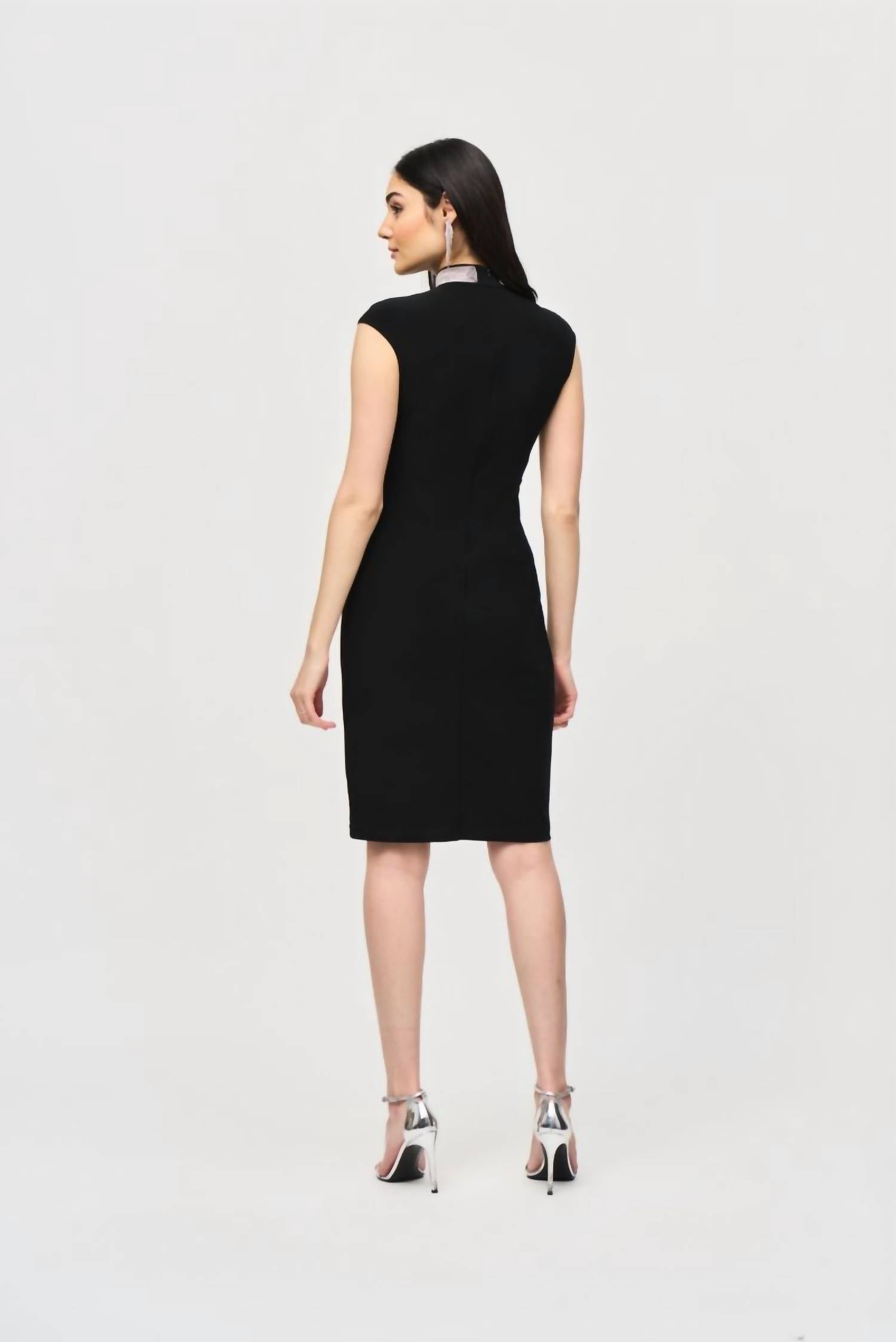 Introducing the Joseph Ribkoff Embellished Choker Collar Sheath Dress, an elegant piece designed to captivate. This dress features cap sleeves, crafted from a silky knit fabric: 96% Polyester, 4% Spandex, and finishes at knee-length. A back zipper closure enhances its fitted silhouette, bringing a touch of sophistication to any wardrobe. Made in Canada, with care instructions to hand wash in cold water, hang to dry in the shade, and low iron if needed on reverse.
