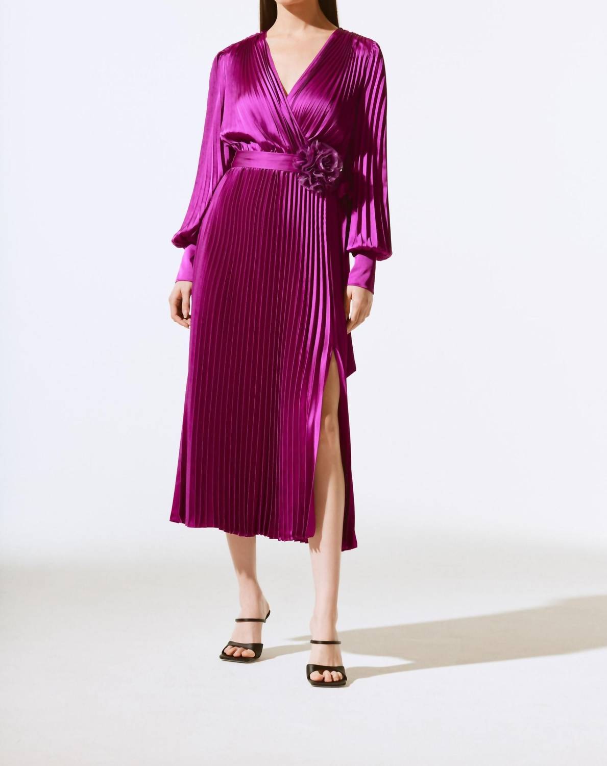 Just add slides or mules and you are good to go. Elevate your holiday party wardrobe with the Joseph Ribkoff Pleated Satin Belted Midi Wrap Dress, a standout choice in a textured Empress hue. This elegant dress features long puff sleeves with smocked cuffs, a V-neckline, and a self-tie sash closure. Crafted from 96% Polyester and 4% Spandex, it is made in Canada and showcases a hem that gracefully falls to the calf. For care, hand wash in cold water, line dry, and avoid tumble drying to maintain its stunning look.