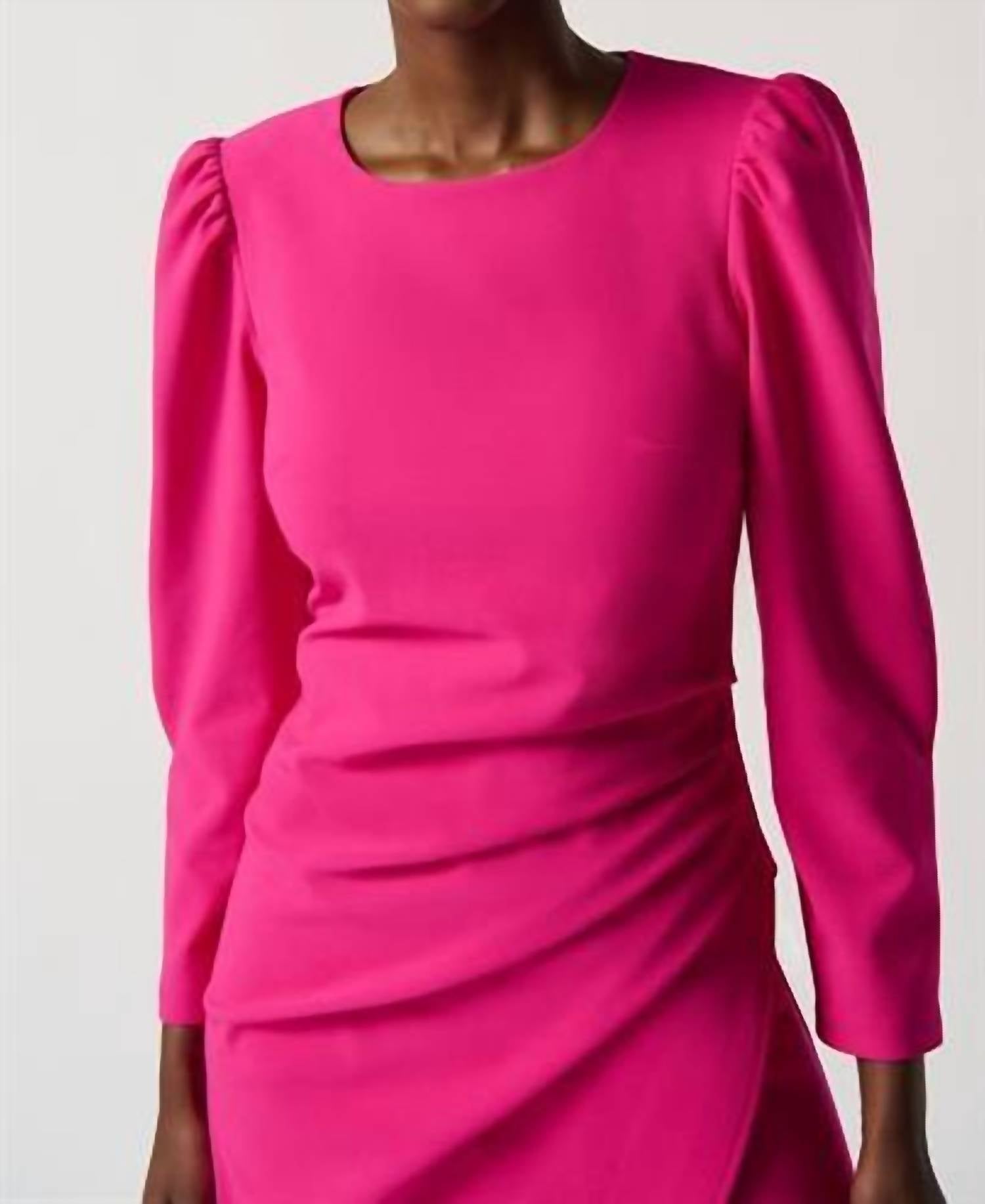 A short and breezy dress for those warmer days. Make a statement with the Joseph Ribkoff Sheath Wrap Dress, a bold addition to your wardrobe in striking hot pink. Crafted from 95% Polyester and 5% Spandex, it features long puff sleeves and pleat details that complement its elegant scoop neckline. Its mini length and solid twill fabric create a chic silhouette perfect for any dinner party. This dress is finished with a convenient zip closure and requires hand washing to maintain its vibrant color.