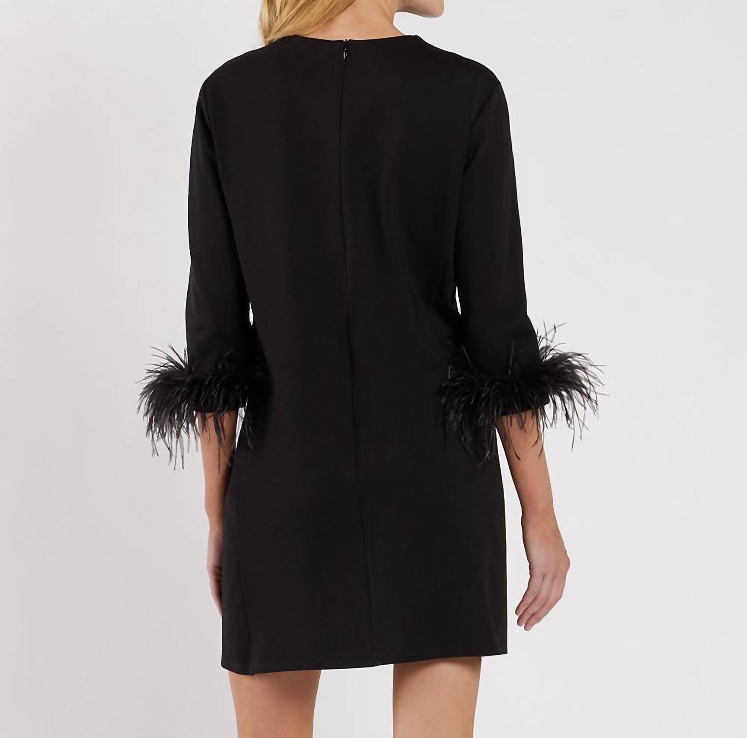 Introducing the Franca Mini Dress by JUDE CONNALLY, a chic piece in Black Feathers perfect for making a statement this season. This dress showcases three-quarter sleeves with eye-catching feather cuffs and a classic crew neckline, blending timeless elegance with a playful twist. Composition: 62% Rayon, 33% Nylon, 5% Spandex. Garment Length: 35 inches from high point of shoulder. Closure: Invisible zipper at center back. Care Instructions: Machine wash and tumble dry. Model is 5'9" and wearing size Small.