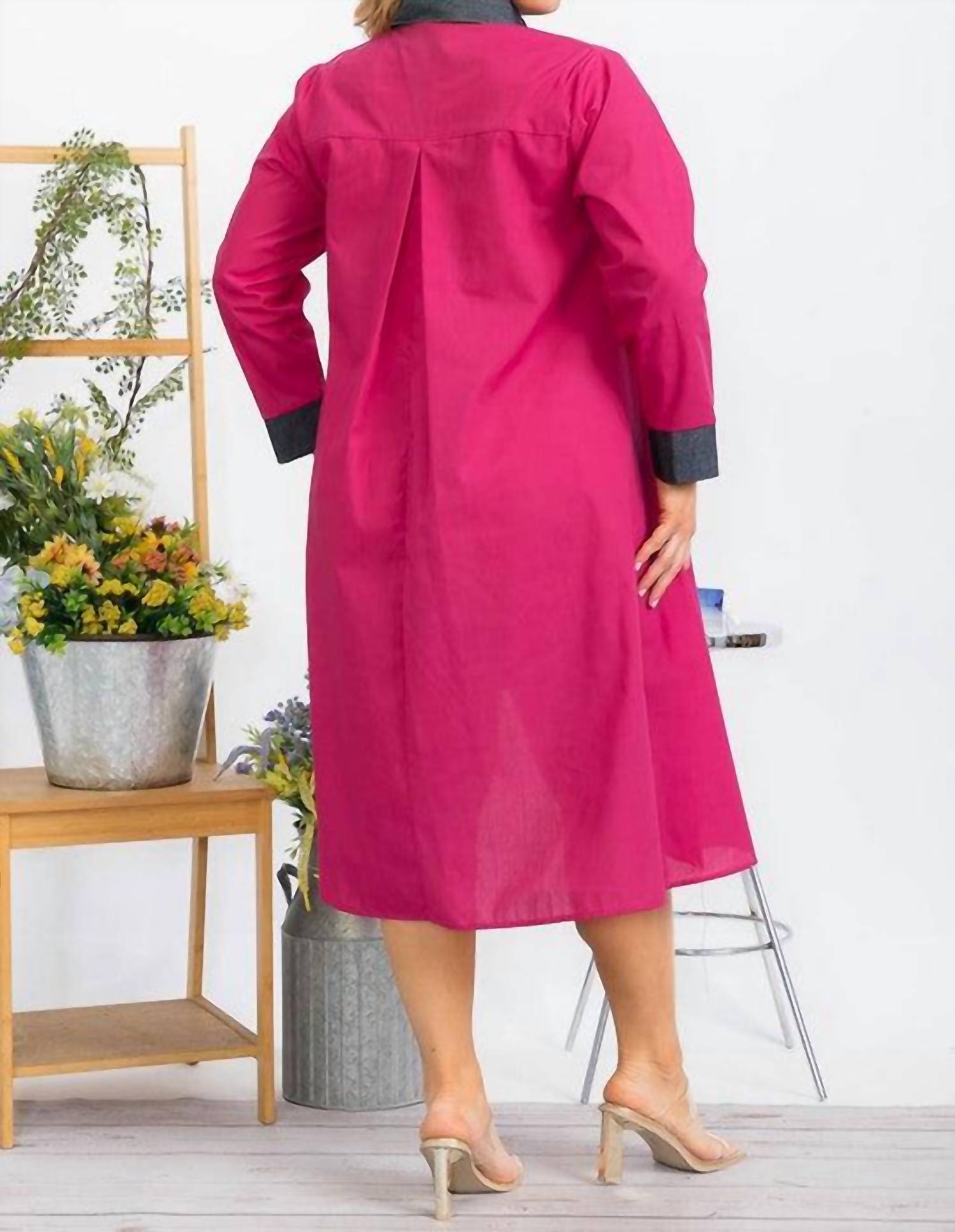 Just add slides or mules and you are good to go. Embrace minimalist elegance with the Asymmetrical Shirt Dress With Contrast Collar by Karen T Design, crafted in a solid white fabric. Featuring long sleeves and a denim trim, this dress boasts a distinctive hi-low hemline and a button closure for a chic finish. The oversized, long-body silhouette with a shirt style and collar is perfect for a summer outing or a vacation. This piece redefines versatile fashion with effortless ease.