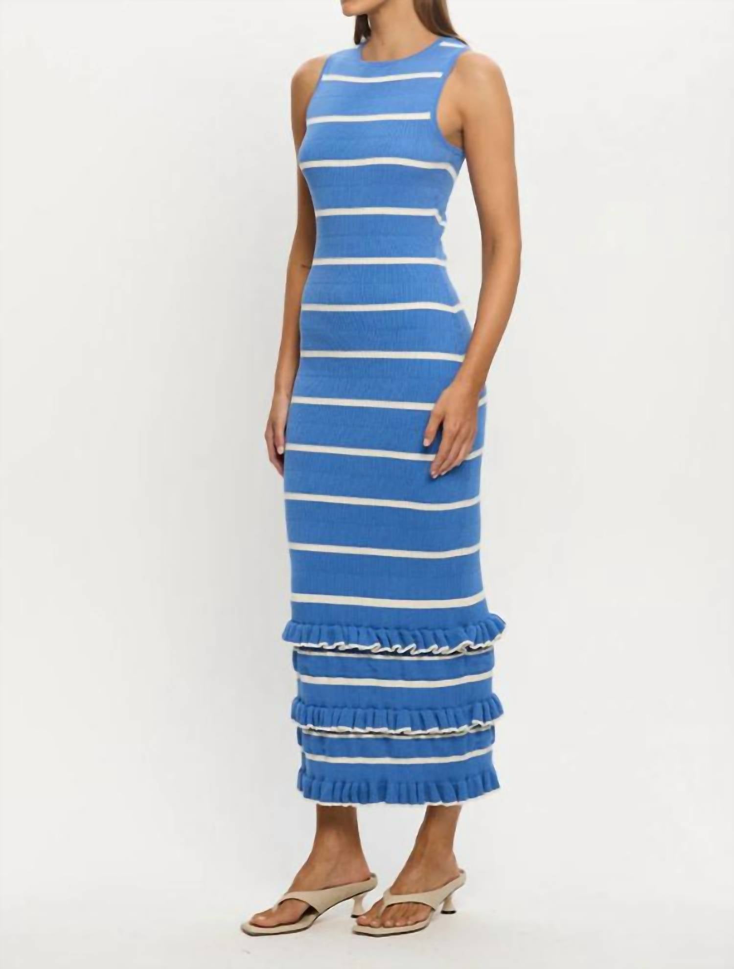 Who doesn't love a good maxi dress? This one you'll be reaching for season after season. Experience the ethereal charm of the Rafaella Maxi Dress by KIVARI in a delightful blue stripe. This sleeveless, bodycon silhouette is crafted from 98% cotton and 2% elastane, offering both a fitted and stretchy feel. Adorned with gathered tiered ruffles and delicate frill detailing, it boasts adjustable thin straps and contrast cream edging towards the hem. With a pull-on closure, it is fully lined and perfect for any spring occasion. Care instructions: Hand wash and lay flat to dry.