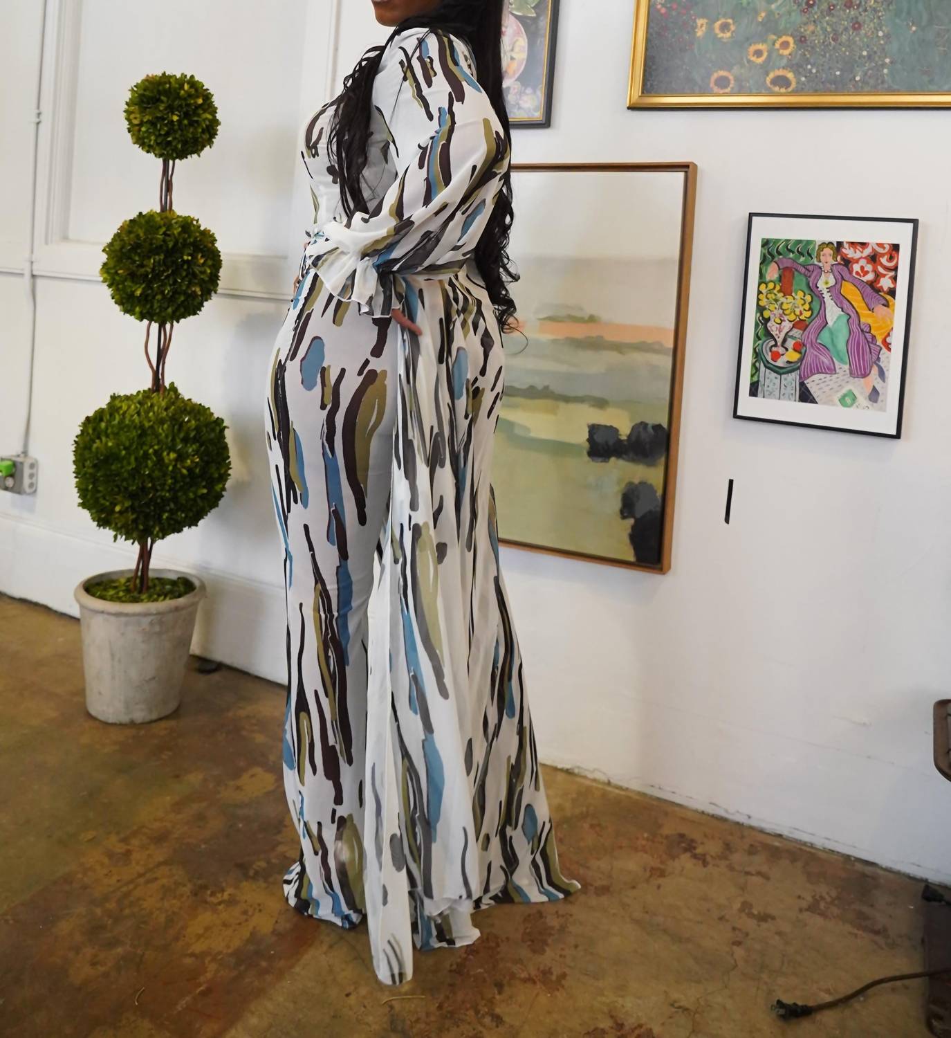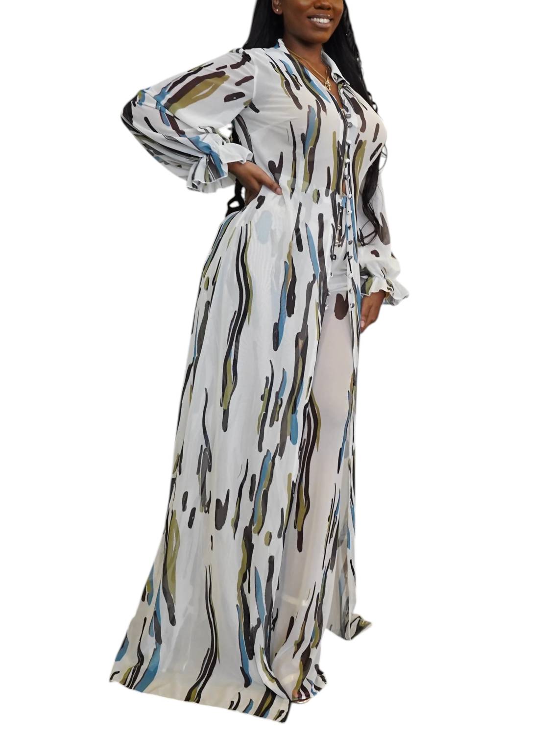 Cute and comfortable, this long sleeve dress has it all. Introducing the Island Duster Dress by Koy & Victoria, a boho chic masterpiece in the vibrant Ada Print. This long-sleeve fit and flare piece features a lightweight, breathable mesh material, ensuring comfort and style throughout the summer. This floor-length dress, with a dramatic thigh slit and a square hem, is the perfect vacation staple. Composition: 90% Polyester, 10% Elastane. Closure: Button closure. Care: Machine wash gentle, hang to dry. Model Seidi is 5'10" wearing size S; A'lexsiss is 5'4" wearing size L.