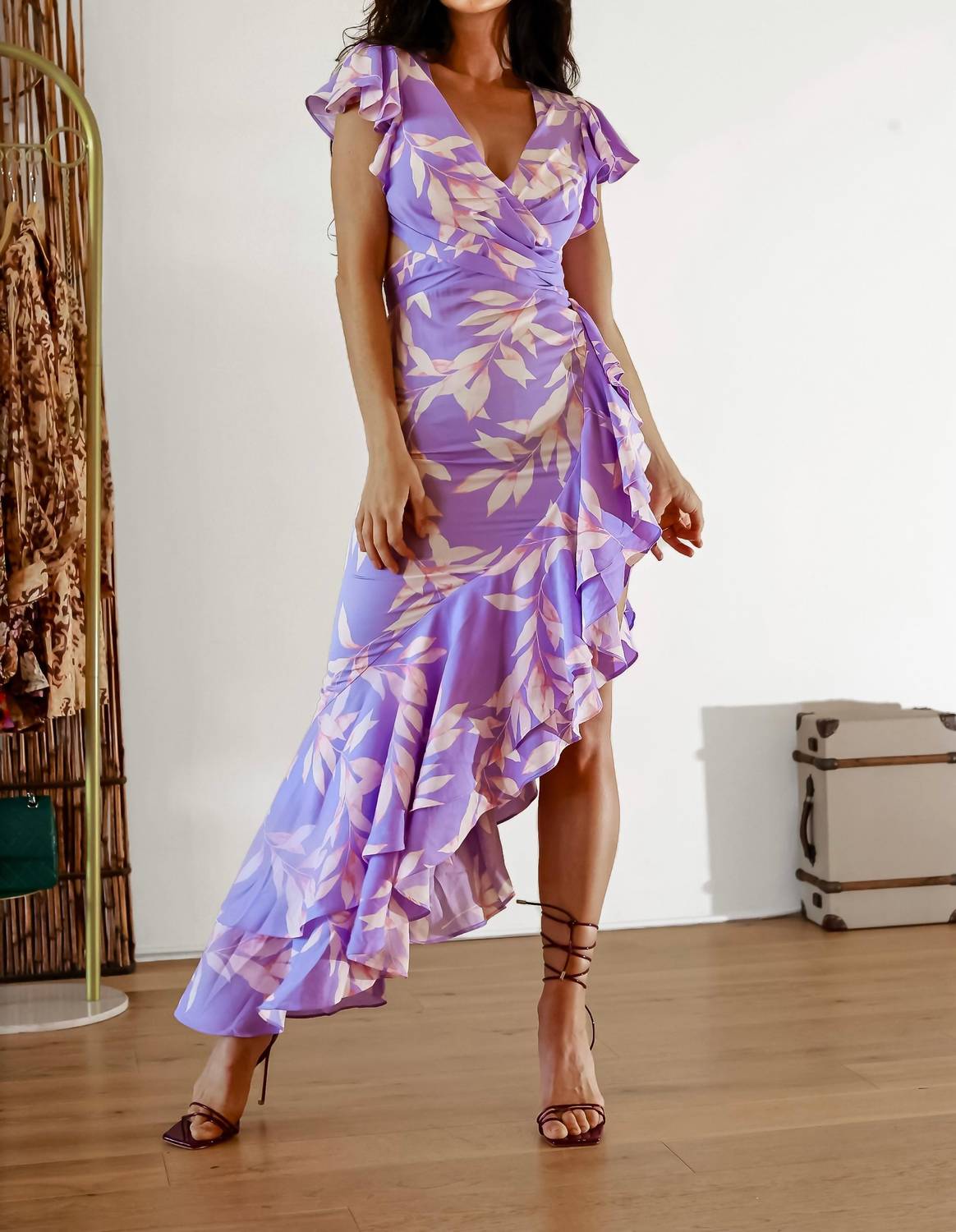 A maxi dress that is just as cute as it is comfortable. Add a touch of drama to your wardrobe with the Salsa Infusion Cut Out Waist Maxi Dress from Little Secret Of Mine. This sleeveless A-line maxi dress, crafted from 100% polyester, features a bold deep V-neckline and an asymmetric ruffled hemline, perfect for Boho chic fashion. Designed in a vibrant purple pattern, the dress offers chic cut-out waist details with a high side slit and a back tie spaghetti strap for a stunning finish. Closure type is a side zipper; care for this piece with a machine wash and tumble dry. Model is wearing a size small.