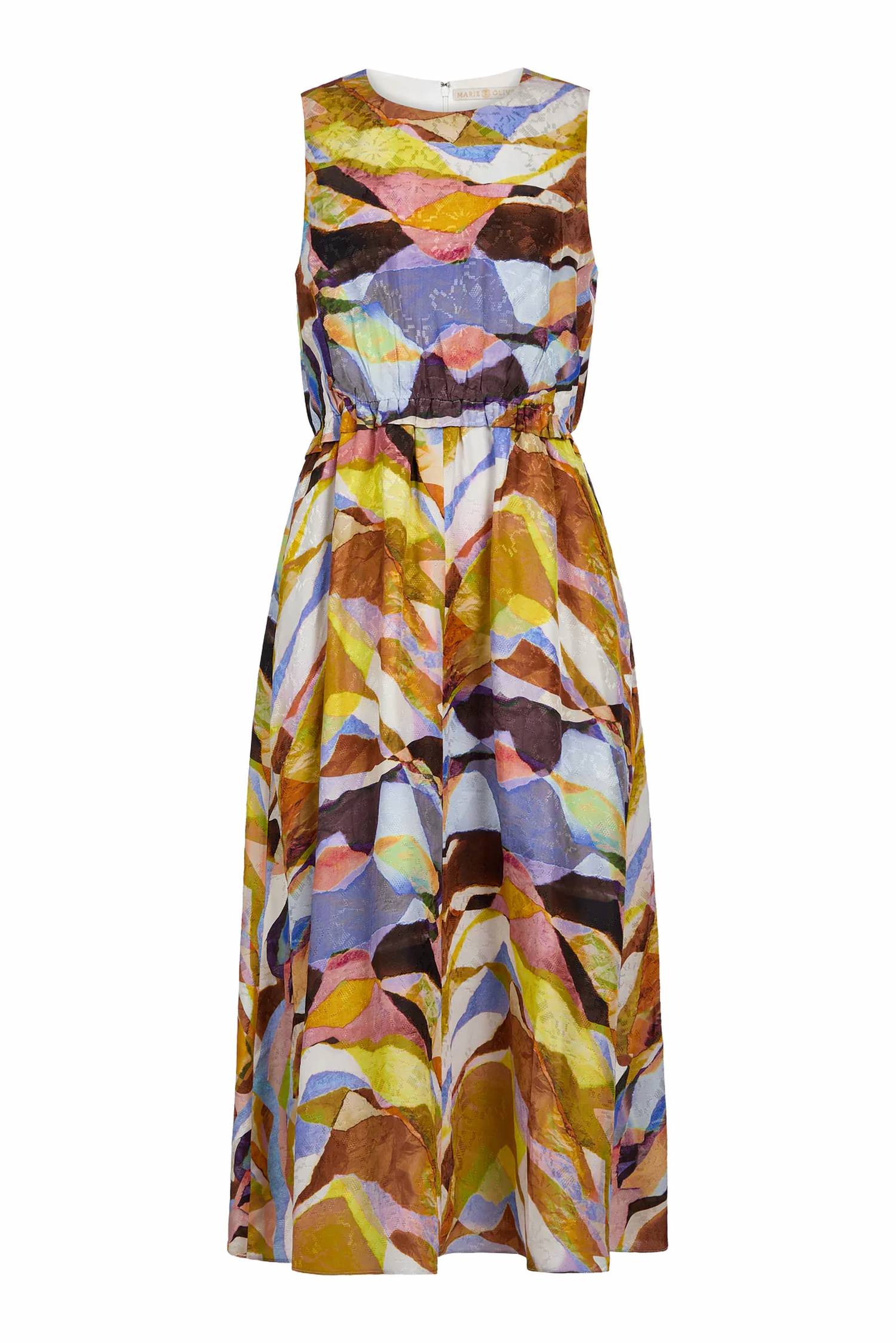 Introducing the Jala Dress by Marie Oliver, a striking addition to your spring wardrobe in an eye-catching Stained Glass pattern. This sleeveless, A-line midi dress is crafted from a luxurious blend of 51% silk and 49% viscose, offering both elegance and comfort. The design features an elastic waist with ruffle detailing, side seam pockets, and a center back invisible zipper with hook and eye closure. Care: Dry clean only, ensuring its lasting appeal and vibrant look.