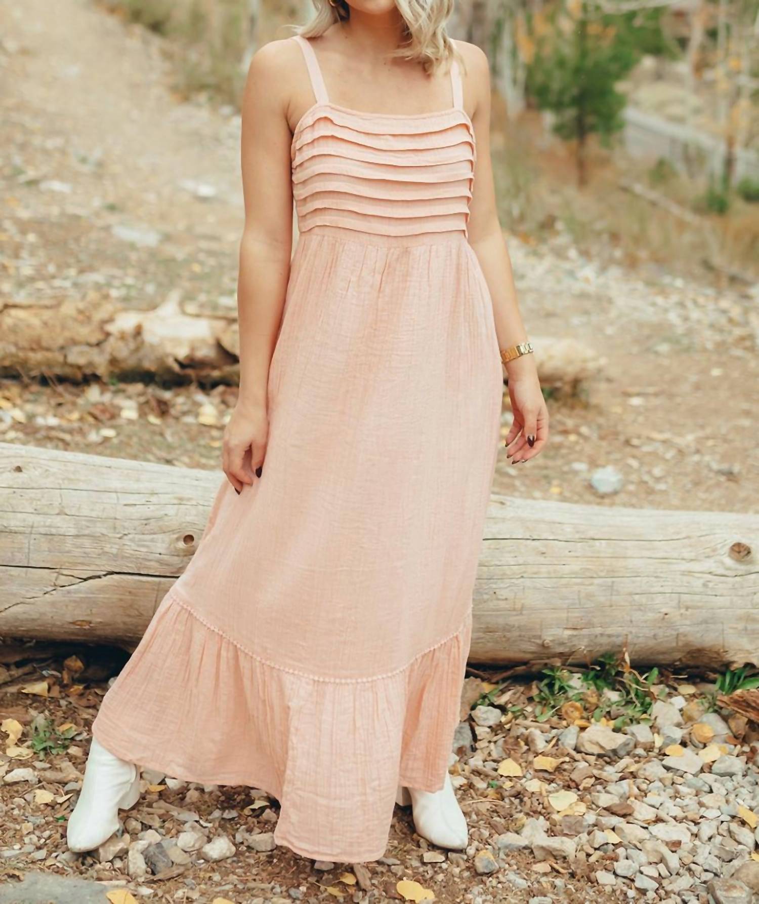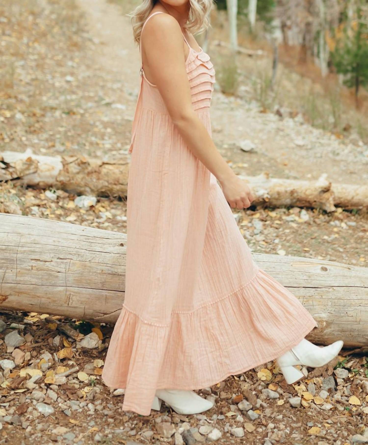 A maxi dress that is just as cute as it is comfortable. Elevate your wardrobe with the Rose Maxi Dress by People of Leisure, an impeccable choice for your next holiday party. This maxi-length dress features adjustable spaghetti straps and a distinctive square neckline on both the front and back. Crafted from 100% organic cotton, it showcases a tiered skirt and delicate ruffles on the chest, all in a vibrant Pacific Pink fabric. Originating from family-owned factories in India, the dress ensures comfort and style, with the inclusion of a convenient button closure. Care: Machine washable. Available in sizes S-XL.