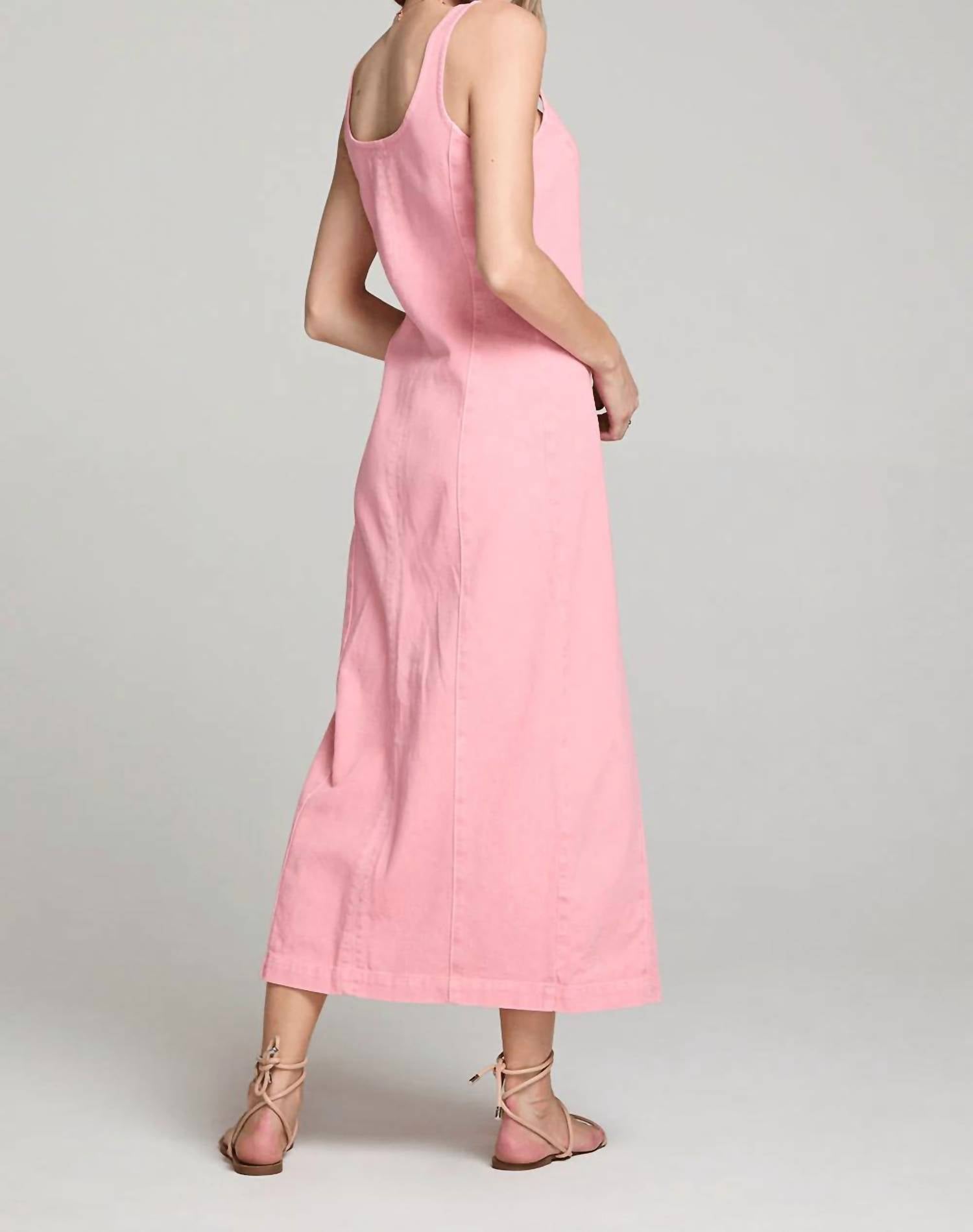 The perfect length dress does exist. The Solara Midi Dress by Saltwater LUXE is a chic and versatile addition to any wardrobe. This sleeveless dress, crafted from 100% cotton, offers a fitted and flattering silhouette in a stylish Bellini hue. With a convenient front button closure and imported quality, it is perfect for dressing up or down. Care for this piece is simple with machine wash instructions. Model is 5'9" and wearing a size small.