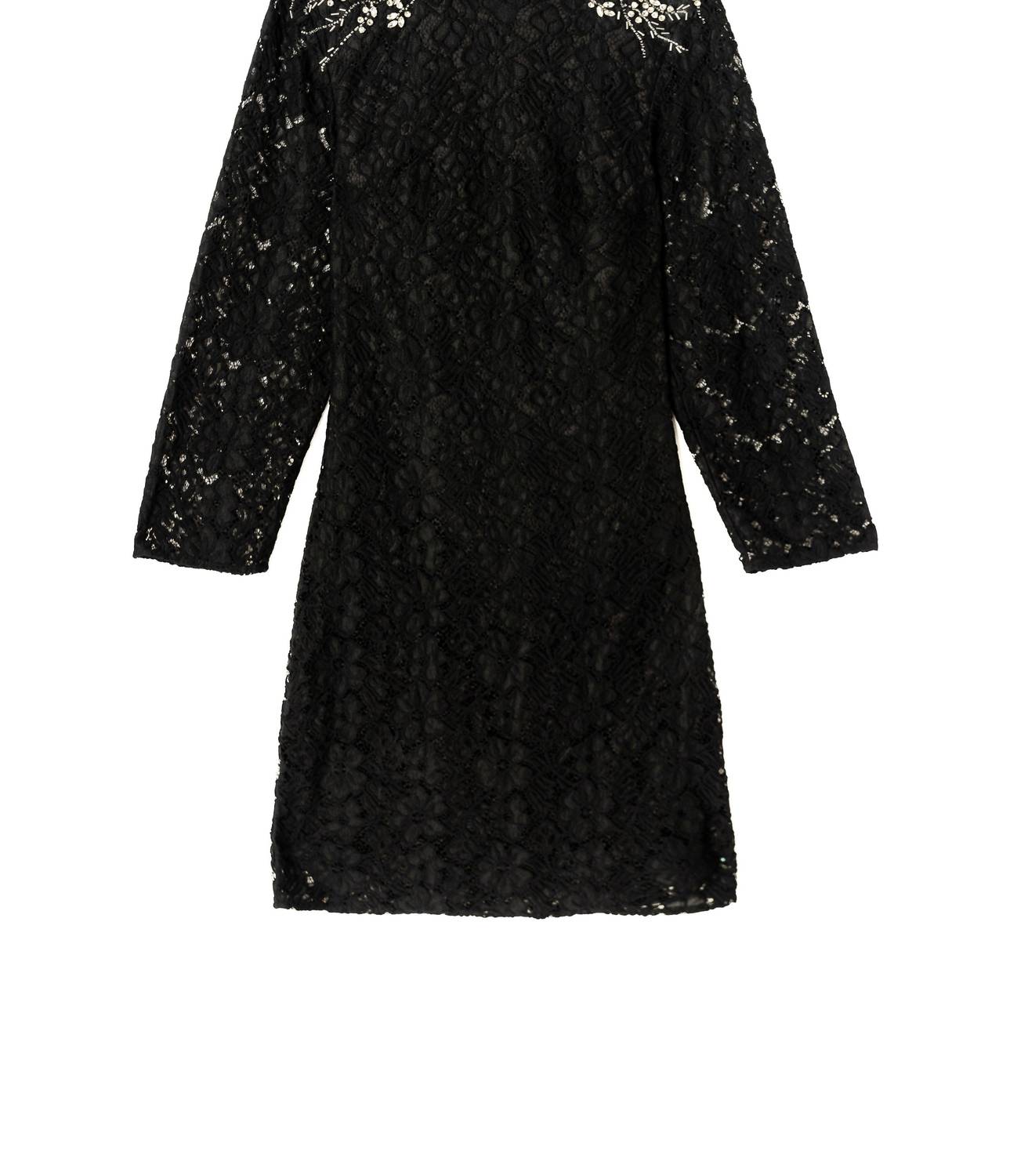 Introducing the Women's Diamante Work Lace Dress by Sasha+Z, a stunning evening piece in timeless black. This dress features long, semi-sheer lace sleeves and a sophisticated high mock neckline, accentuated by exquisite diamante embellishment on the shoulders. Material: Recycled Nylon Lace Fabric with Poly Satin Lycra Lining. Closure: Discreet zip closure. Care: Machine wash cold. Perfect for engagements or Thanksgiving gatherings, this shift silhouette dress exemplifies quiet luxury.