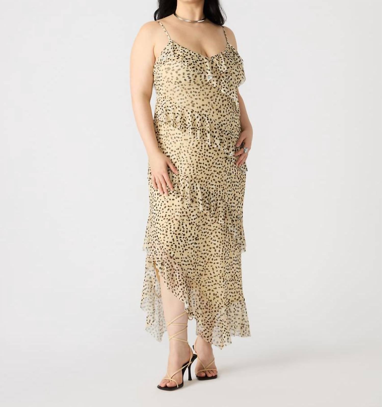 Who doesn't love a good maxi dress? This one you'll be reaching for season after season. The Aida Dress by STEVE MADDEN is a stunning sleeveless maxi designed for those who love elegance and comfort. Adorned in a desert sand hue with an animal pattern, it features spaghetti straps and a flowy A-line silhouette, enhanced by ruffles on both the front and back. Crafted from 96% polyester and 4% spandex, this pull-on dress offers a V-neckline and ensures easy movement. Care: Hand wash only.