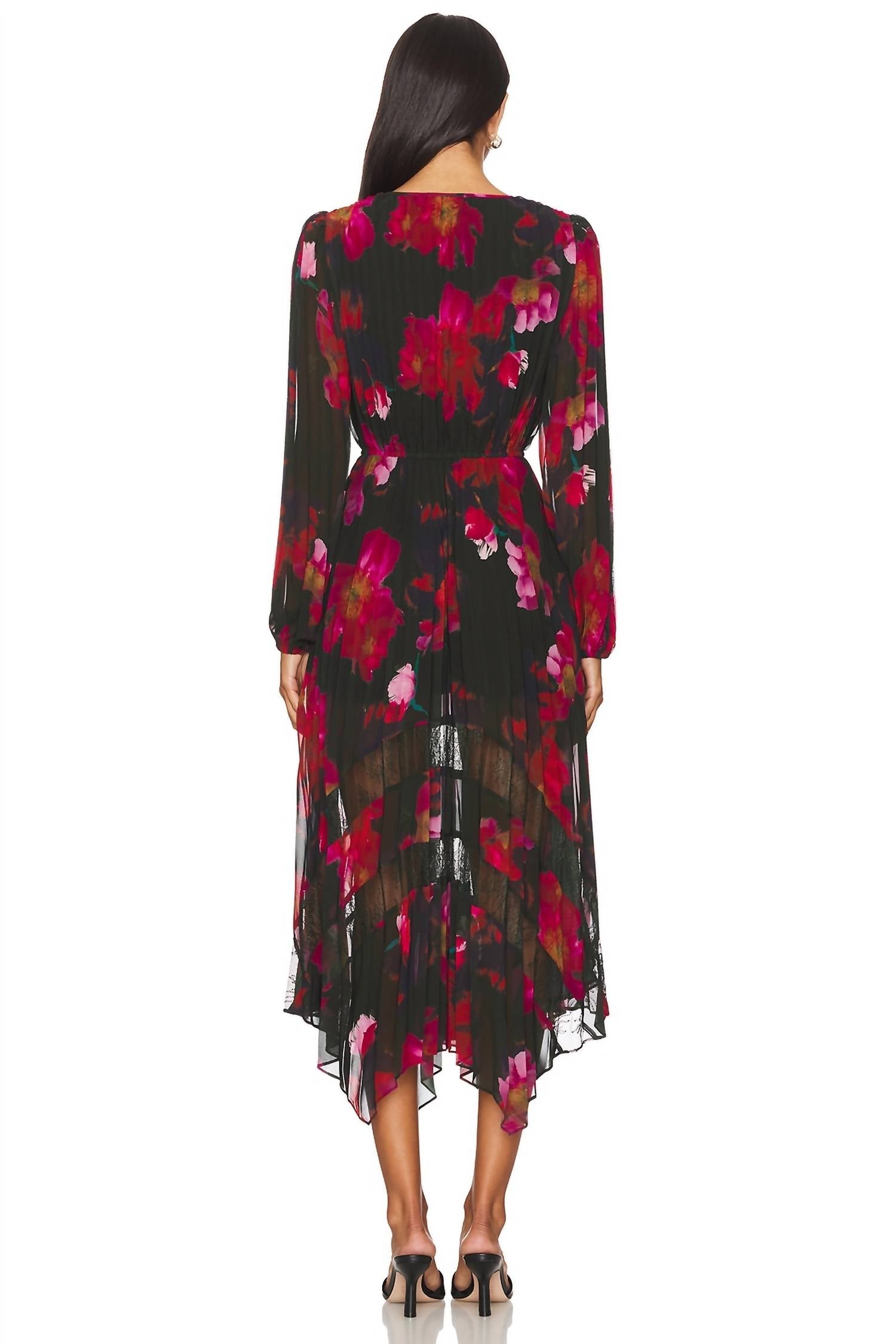 Opt for a playful yet elegant look with the Ari Dress by Steve Madden, a perfect choice for evening events. This long sleeve midi dress features a V-neck and a charming A-line silhouette adorned with allover pleats and a floral pattern. Made from polyester, it includes a back zip closure and an elasticized waist for a flattering fit, complemented by a lace trim skirt and handkerchief hem. Ideal for the fall season, it is easy to care for with machine wash instructions.