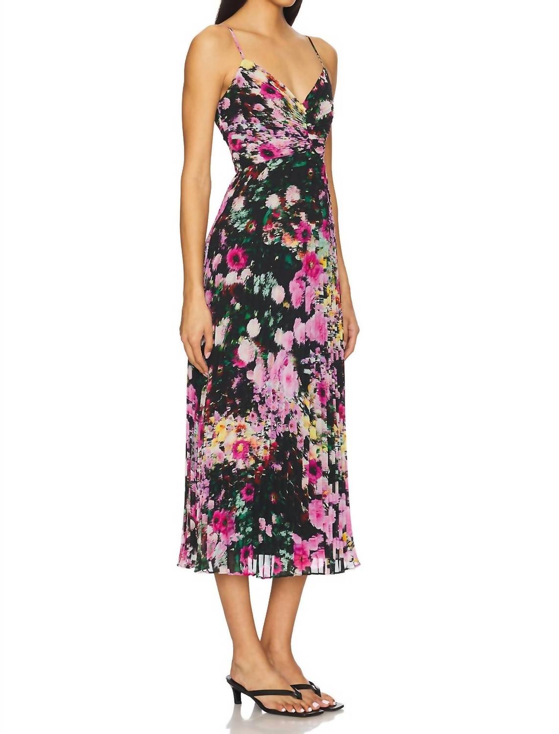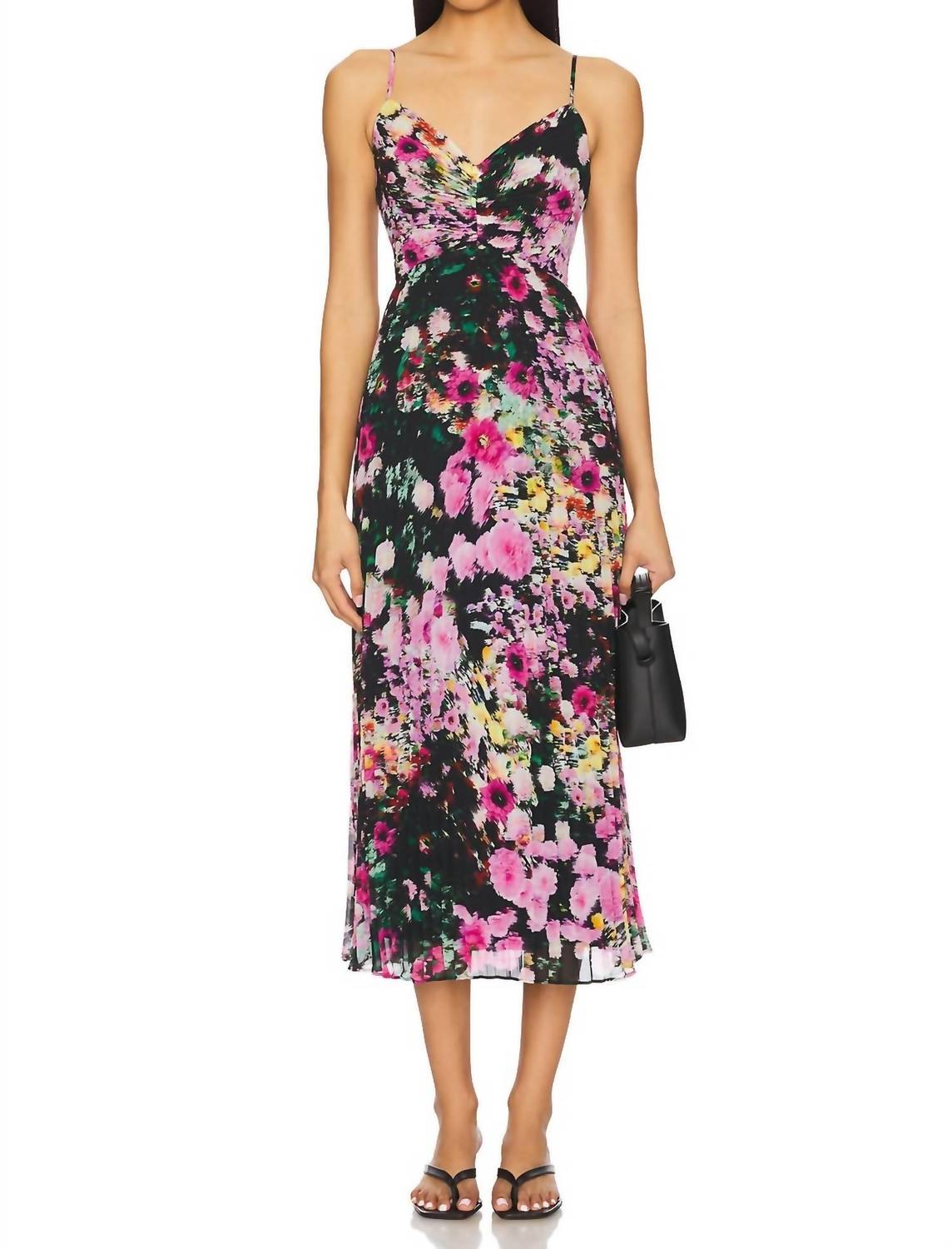Presenting the Ray Dress by Steve Madden, a sophisticated midi dress in Black Multi with a feminine floral pattern. Designed for the modern woman, it features spaghetti straps and a scoop neckline, crafted from 100% polyester. The dress is made in China, fully lined, and equipped with a hidden side seam zipper for a sleek appearance. Care instructions recommend machine washing cold and laying flat to dry, ensuring easy maintenance while retaining elegance.