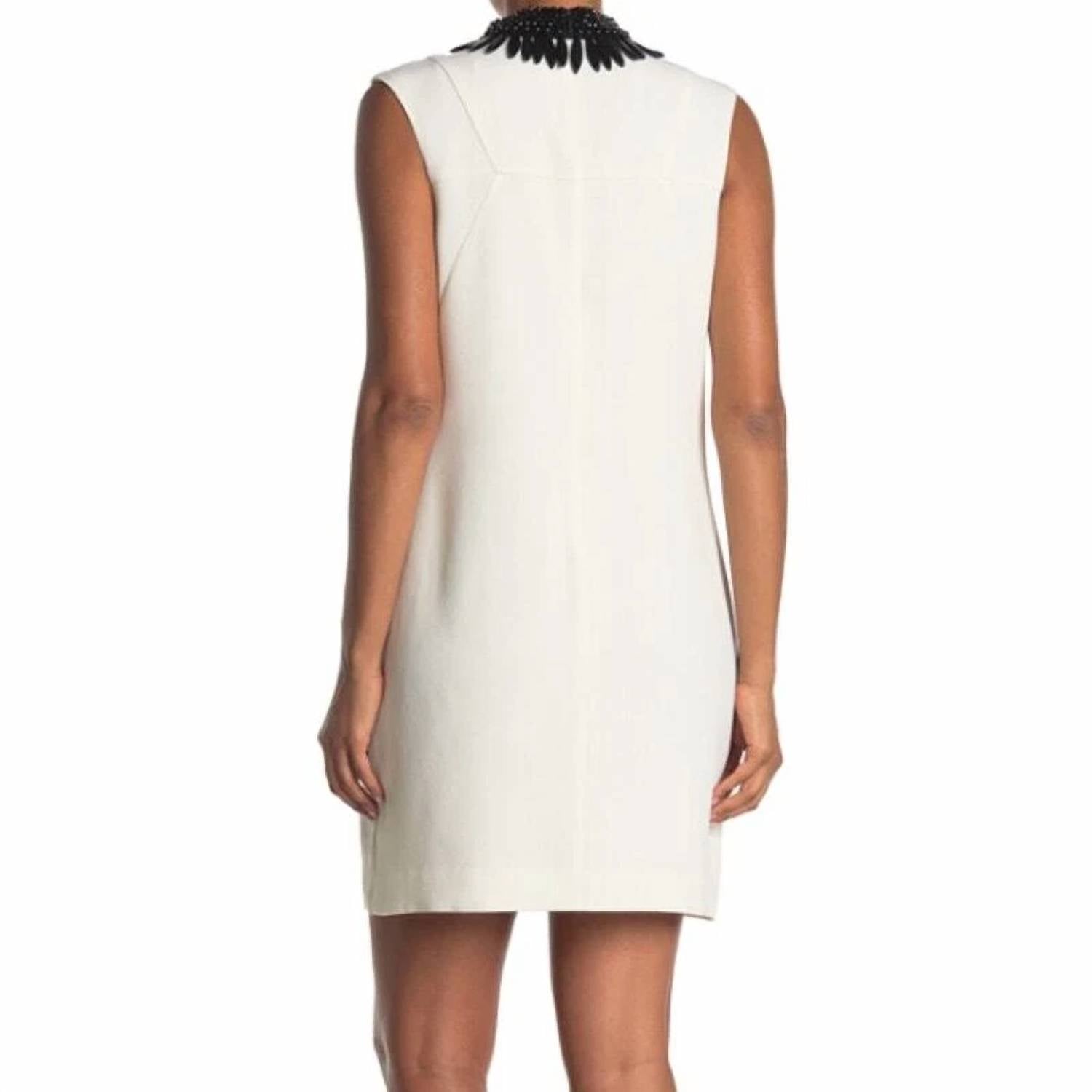 Elevate your wardrobe with the Keen Dress by Trina Turk, a preppy yet elegant choice for women. This white mini dress features a sleeveless design and an embellished mock neck that adds a touch of sophistication. Made from polyester with a secure back zip closure, it's both stylish and functional. Care for this solid-patterned piece with dry cleaning as per instructions.