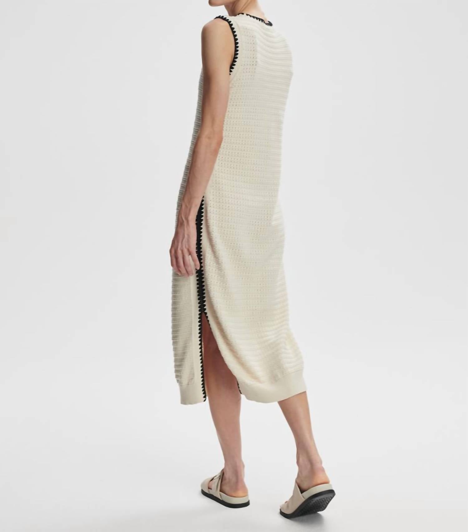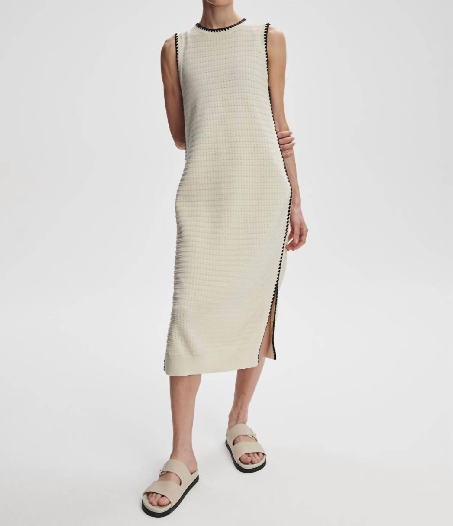 A midi dress so versatile, your options for wearing it are endless. Elevate your everyday style with the Dwight Tank Knit Midi Dress by VARLEY, a refined piece in birch with a textured striped pointelle knit. This sleeveless bodycon dress features a modern midi length, making it ideal for beach days with sandals or stylish evenings out. Made from 100% cotton, it comes with a pull-on closure and contrasting scalloped edging that adds a charming touch. Care for this dress by machine washing cool, drying flat, and reshaping while damp.