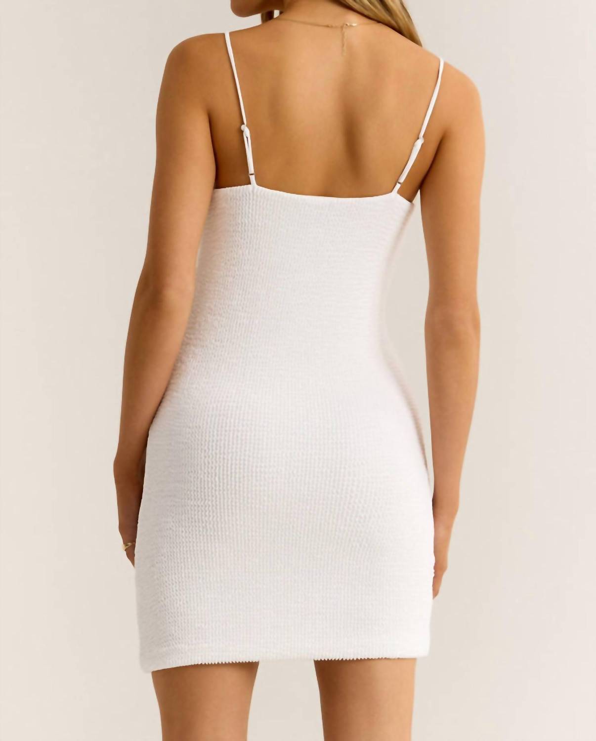 The perfect mini dress for those warmer months. This dress features a scooped neckline and stretchy spaghetti straps. Made from a textured knit, it is fitted and measures 33" from the shoulder. The fabric composition is 97% nylon and 3% elastane for added stretch.