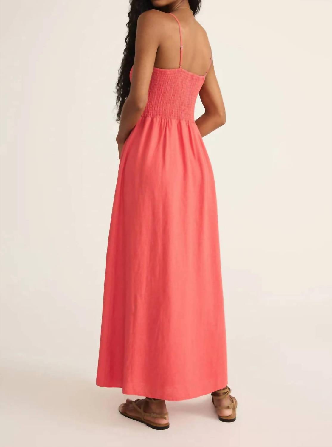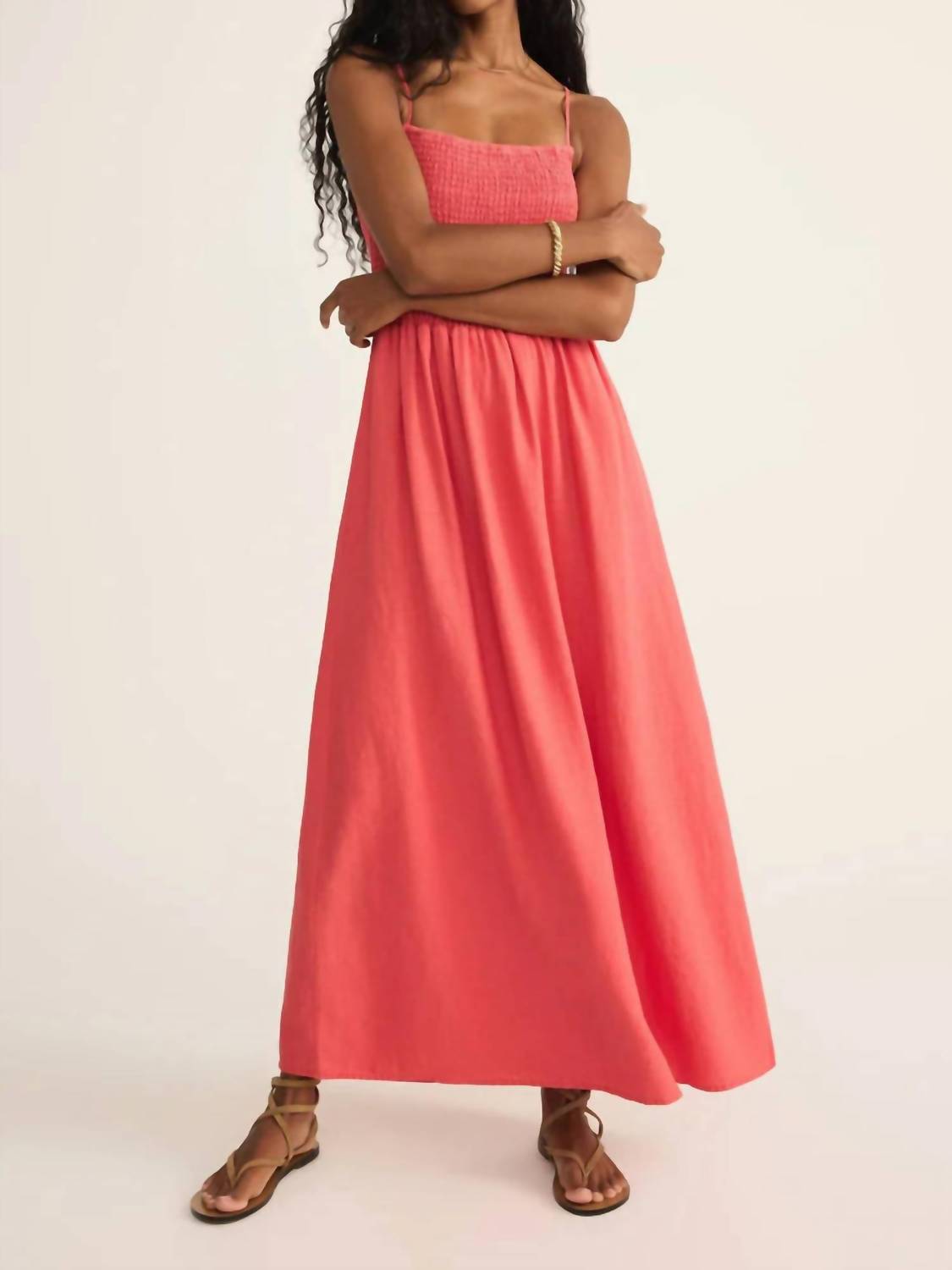 A maxi dress that is just as cute as it is comfortable. Elevate your spring wardrobe with the Bayside Linen Maxi Dress by Z Supply, designed in a vibrant persimmon hue. This sleeveless dress features adjustable spaghetti straps and a flattering smocked bodice, crafted from a soft-washed linen blend of 55% Linen and 45% Rayon. Its flowing A-line silhouette falls gracefully to the ankle, offering a pull-on closure for ease and comfort. The perfect choice for sun-soaked days or elegant evenings, simply machine wash after wear and enjoy its timeless appeal.