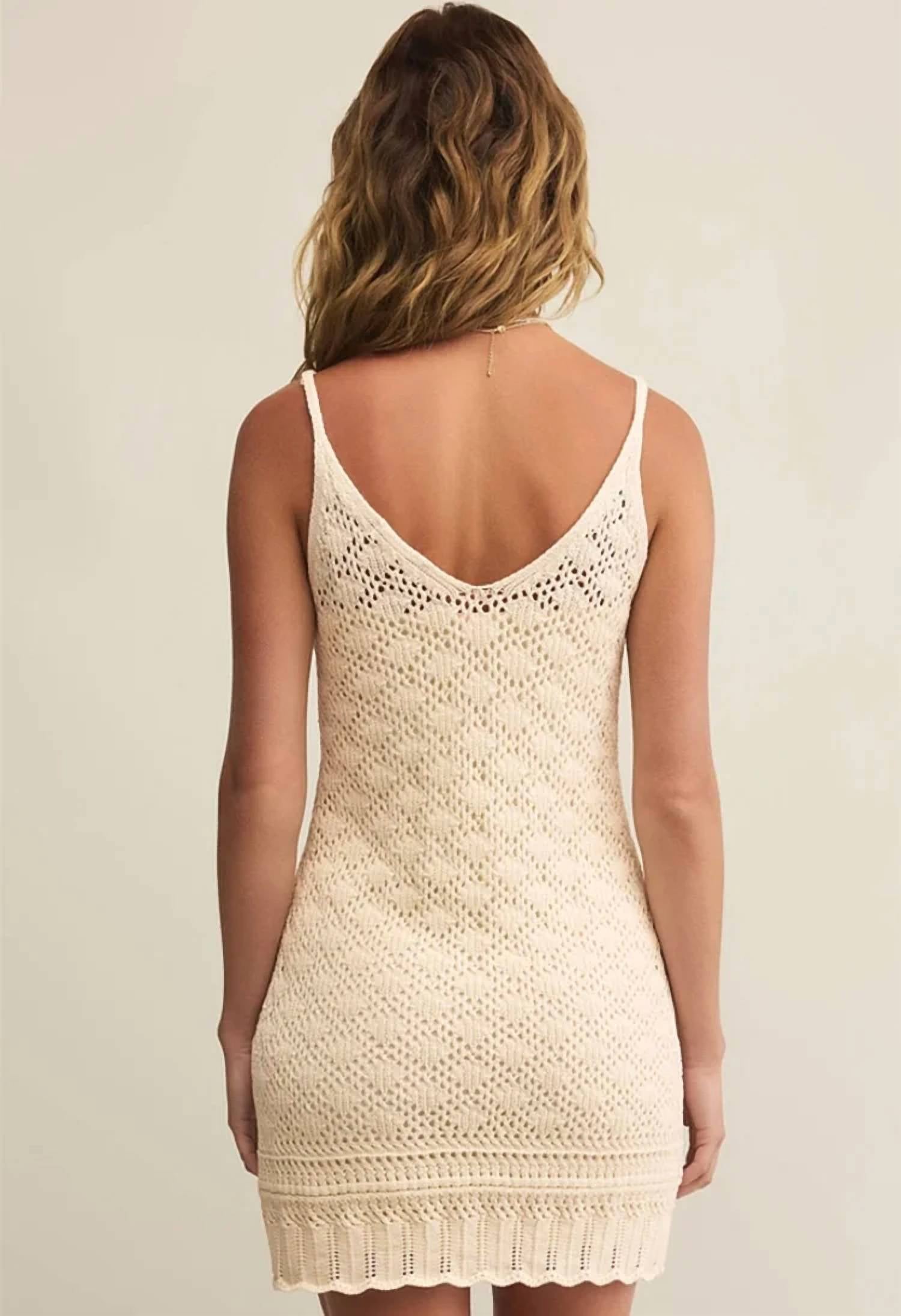 Introducing the Z Supply Charmer Crochet Mini Dress in an elegant beige, perfect for summer holiday parties. With adjustable spaghetti straps and a V-neck, this textured sheath silhouette offers a sophisticated look. Crafted from a lightweight stretch crochet fabric composed of 77% cotton and 23% nylon, it features a convenient pullover design for seamless wear. Made in China and 33.75 inches in length, measurement from size S. It’s best cared for with a hand wash.