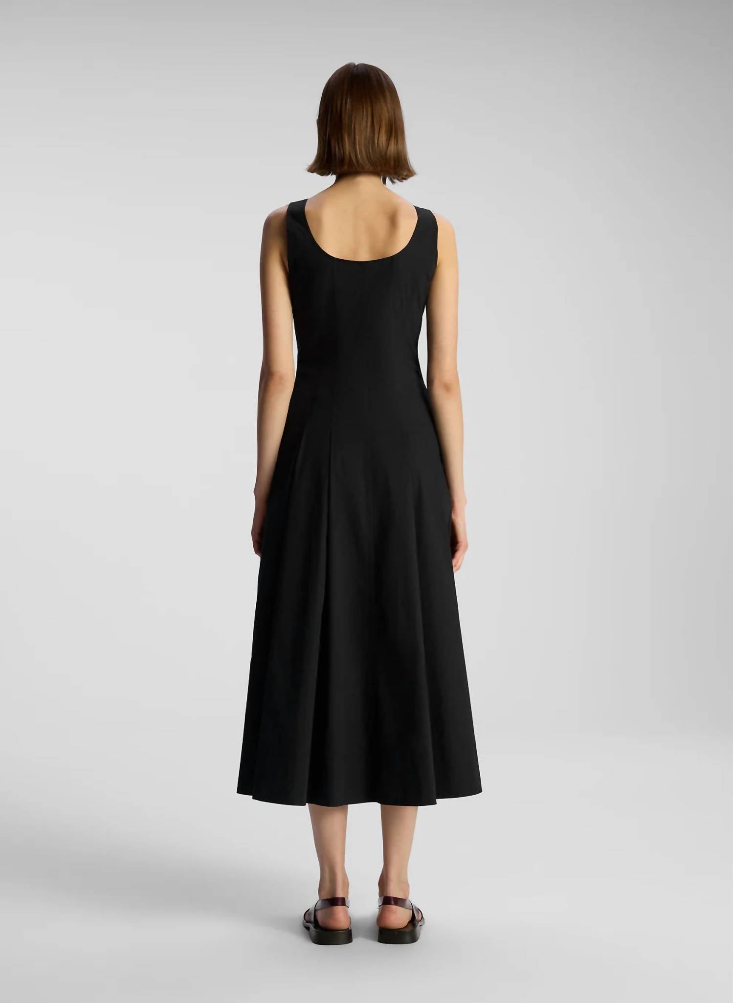 Just add slides or mules and you are good to go. The Isabel Dress by A.L.C. is a stunning addition to your summer wardrobe, showcasing a sleeveless design in solid black that exudes understated elegance. Composed of 96% cotton and 4% elastane, this sheath midi dress offers a sophisticated scoop neckline with soft pleating to accentuate the body's natural curves. Featuring a convenient zip closure, it measures 49.875 inches in length and is tailored true to size, as demonstrated by the model who is 5'10" with measurements of 31" bust, 23" waist, and 34" hips. For maintenance, it requires dry cleaning, ensuring it remains a timeless piece for vacations and minimalist ensembles.