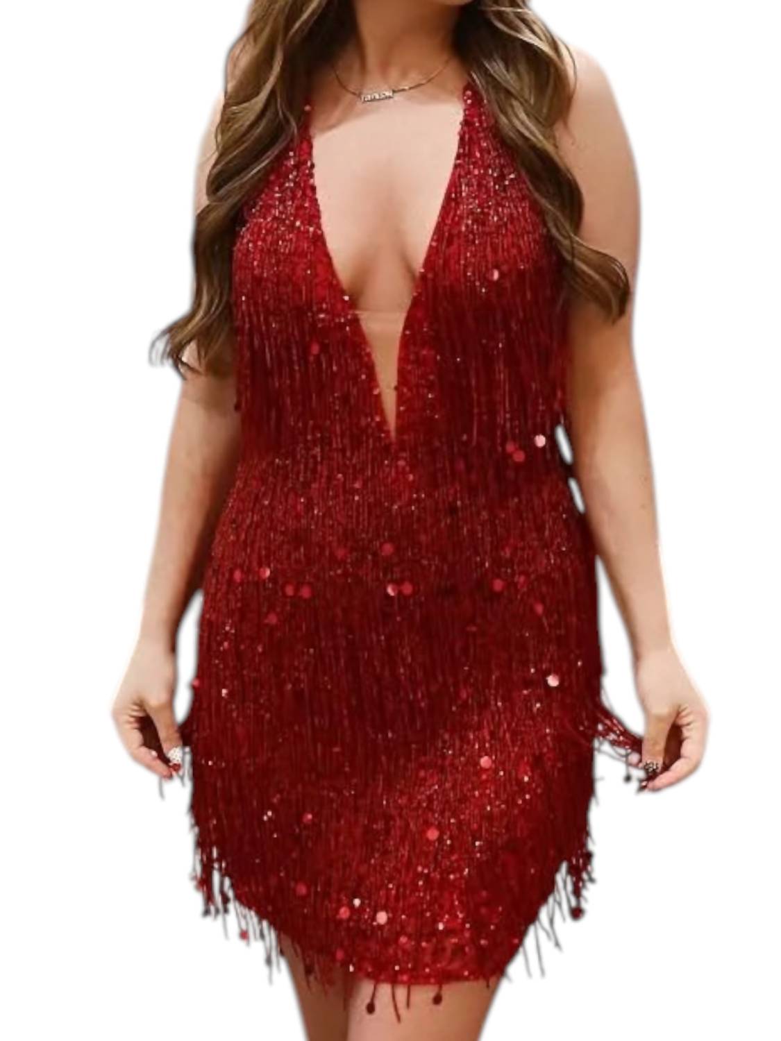 Comfortable and cute, this casual day dress has it all. Introducing the Plunging Neckline Fringe Dress by Aleta, a captivating choice for any cocktail party. This sleeveless bodycon dress in Nude Silver showcases a V-neck and a short length, adorned with fully beaded fringe details that exude glamour. Made with a solid pattern and zip closure, this piece is perfect for celebrating special occasions like New Year's Eve. Care for it easily with machine wash instructions, aligning with its chic and effortless style.