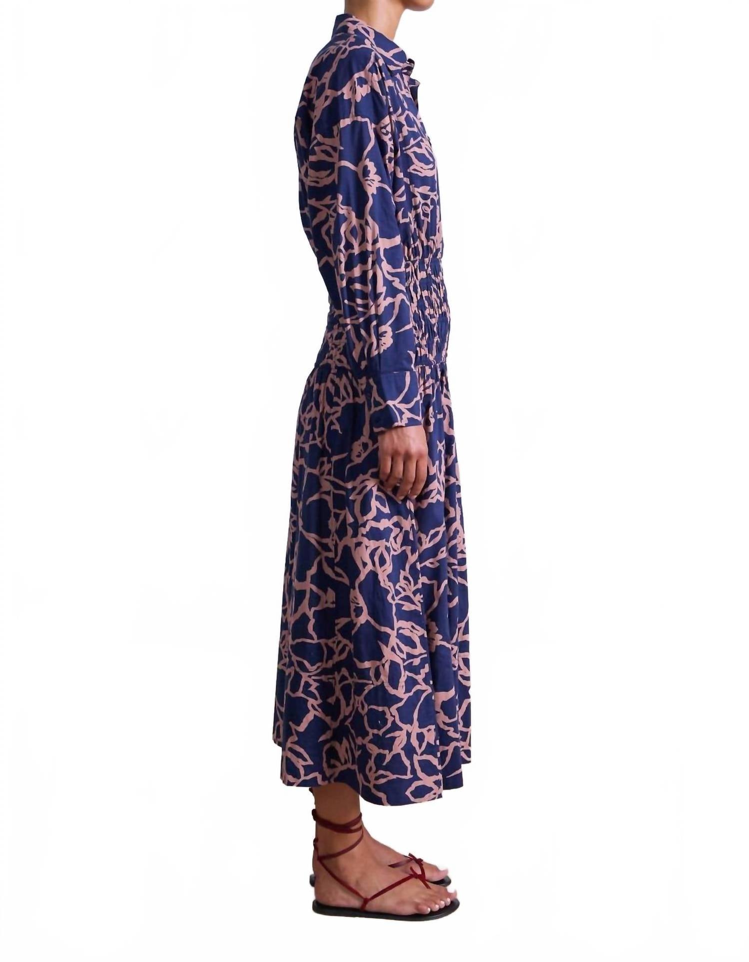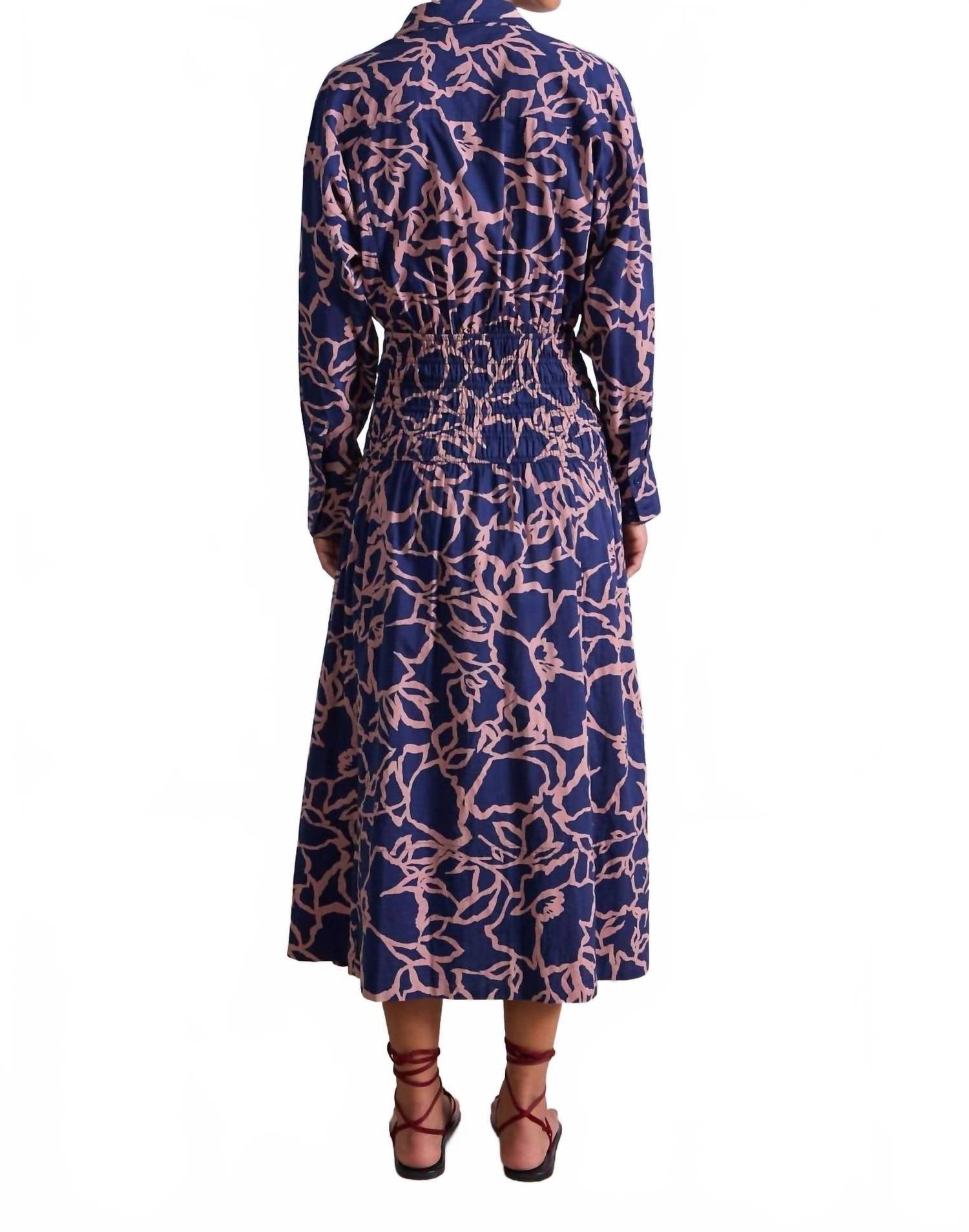 Just add slides or mules and you are good to go. Elevate your vacation wardrobe with the Sophia Smocked Shirt Dress by APIECE APART, showcased in a sophisticated Lace Floral Navy print. This midi dress features long sleeves crafted from 100% organic cotton, offering a soft a-line silhouette with an elastic skirt detail. Made in India, it boasts a dropped shoulder and shirt collar complemented by a front button closure. Care for this exquisite piece through dry cleaning; measurements for size S - Length 52" from shoulder.