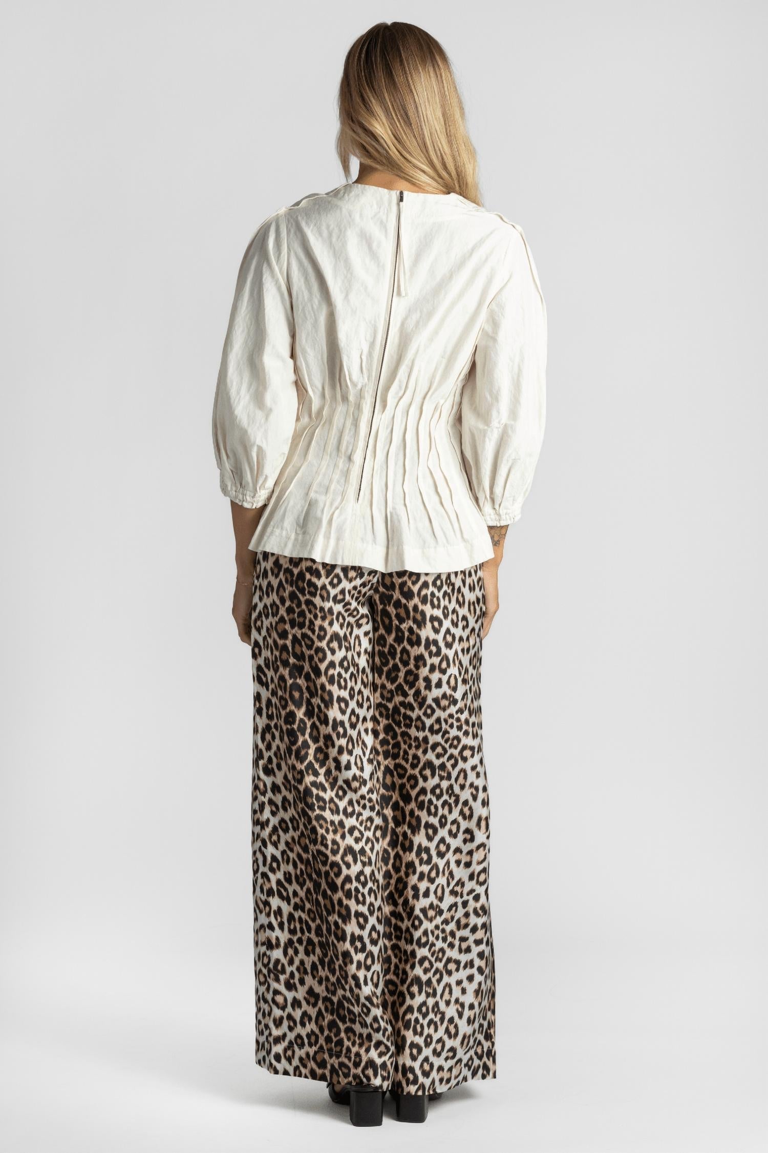 A timeless blouse that will never go out of style. The Rocco Pleat Top by APIECE APART in cream is a chic addition to your summer wardrobe. Featuring three-quarter sleeves and crafted from a cotton blend (57% Cotton, 36% Viscose, 7% Metallic), this blouse offers both comfort and style. Its design includes a pleat detail at the waist, a drop shoulder, and a V-neck, complemented by a convenient zip closure. For care, simply machine wash as required. Model wears size 4 and stands 5'8".