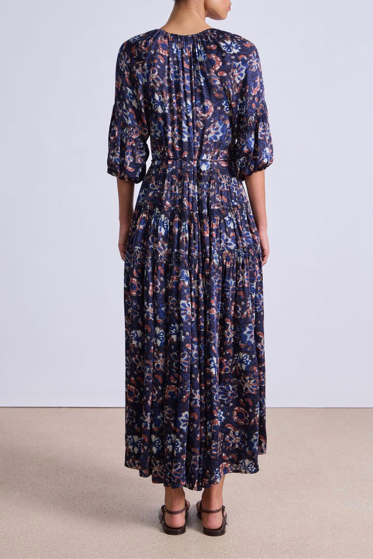 The perfect length dress does exist. Introducing the Women's Santa Cecilia Dress by APIECE APART, a wardrobe staple in Batik Floral Navy perfect for any occasion. This flowy maxi dress features short puff sleeves, a V-neckline, and a tiered skirt with a center front slit for added movement. Crafted from 100% viscose, it includes a removable self-tie belt for customizable styling and closes with a convenient pull-on design. The dress measures 53 inches in length and fits true to size, offering effortless boho chic style for your summer wardrobe. Model is 5'10" and wearing a size small.