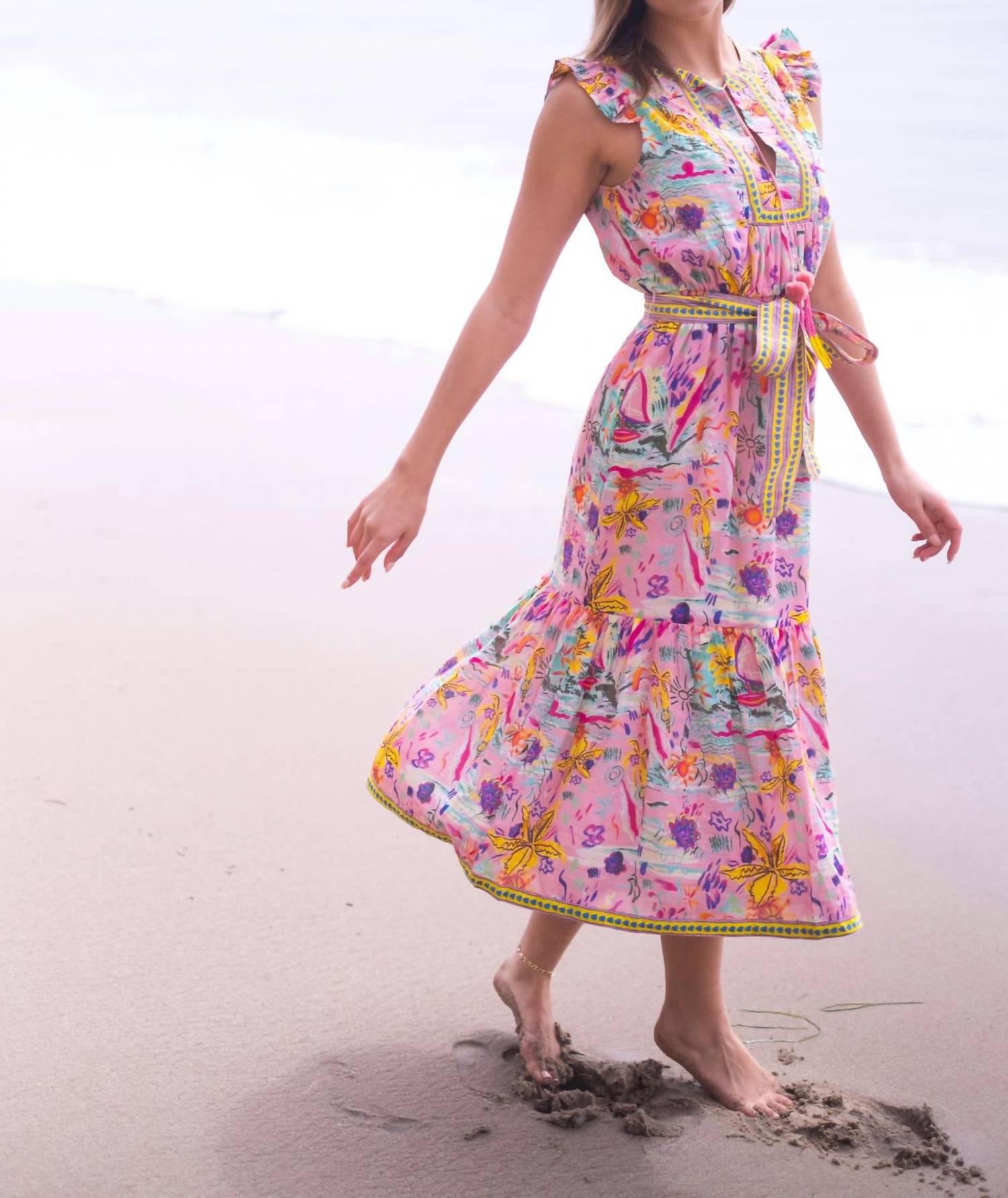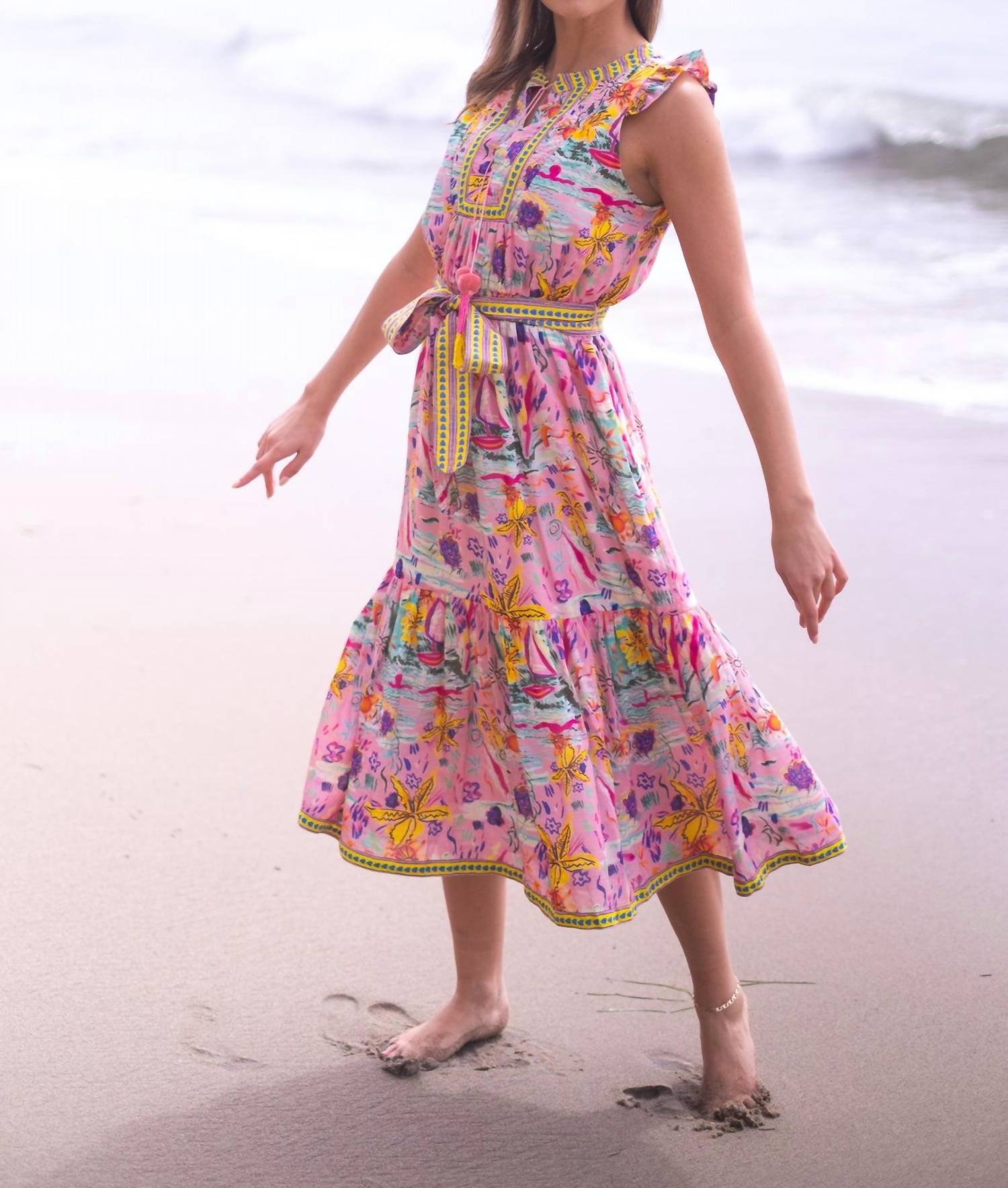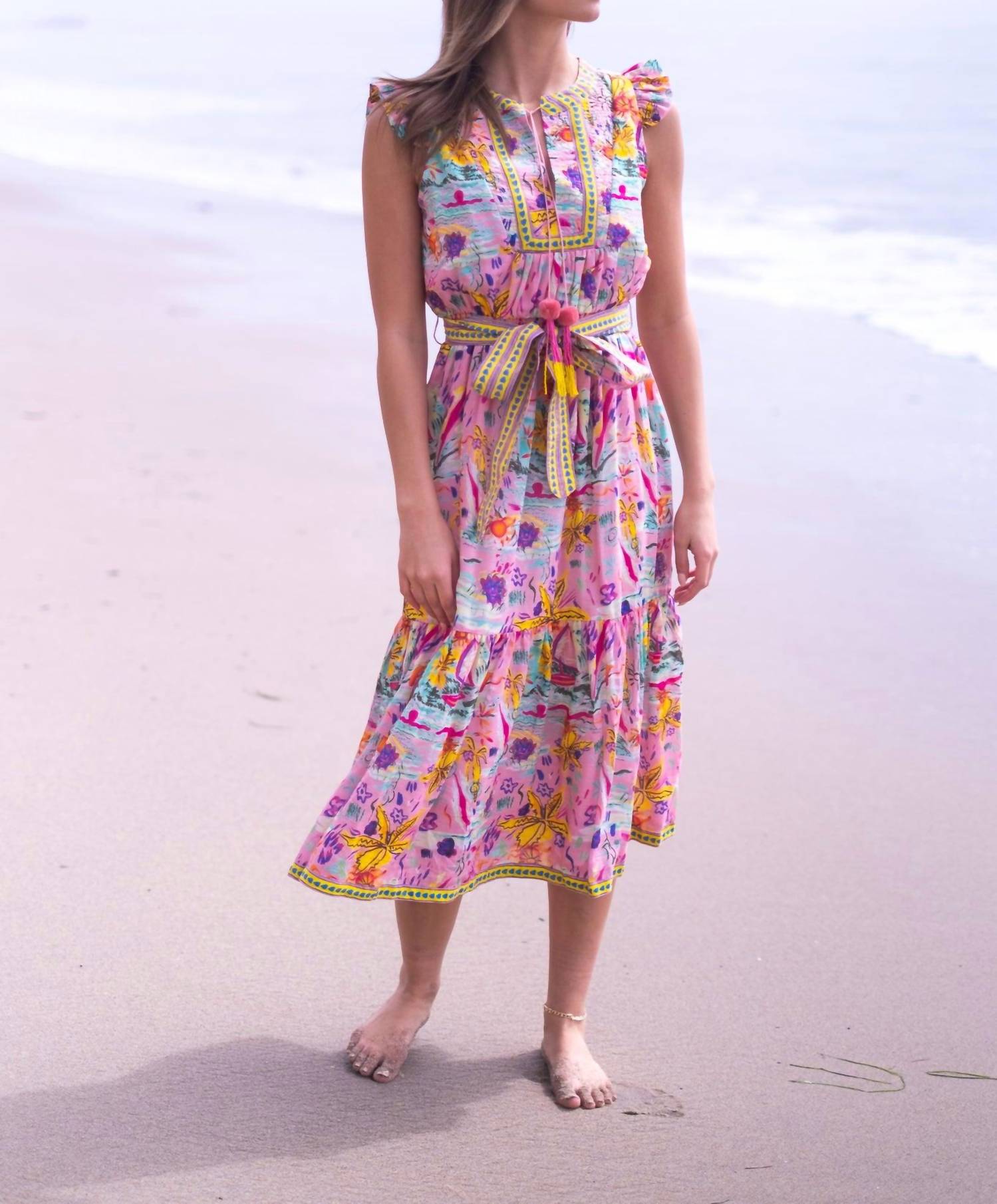 Introducing the Lola Midi Dress by Bell, a captivating blend of bohemian artistry and elegance in a Sunshine Print. This dress showcases delicate ruffle cap sleeves crafted from lightweight silk cotton voile, featuring a hand-blocked floral pattern and artisanal handmade tassels. Designed for vacation and Easter occasions, it offers a pull-on closure and midi length with an elastic waist for effortless, flowing movement. Care: Hand wash for maintaining its beauty and softness.