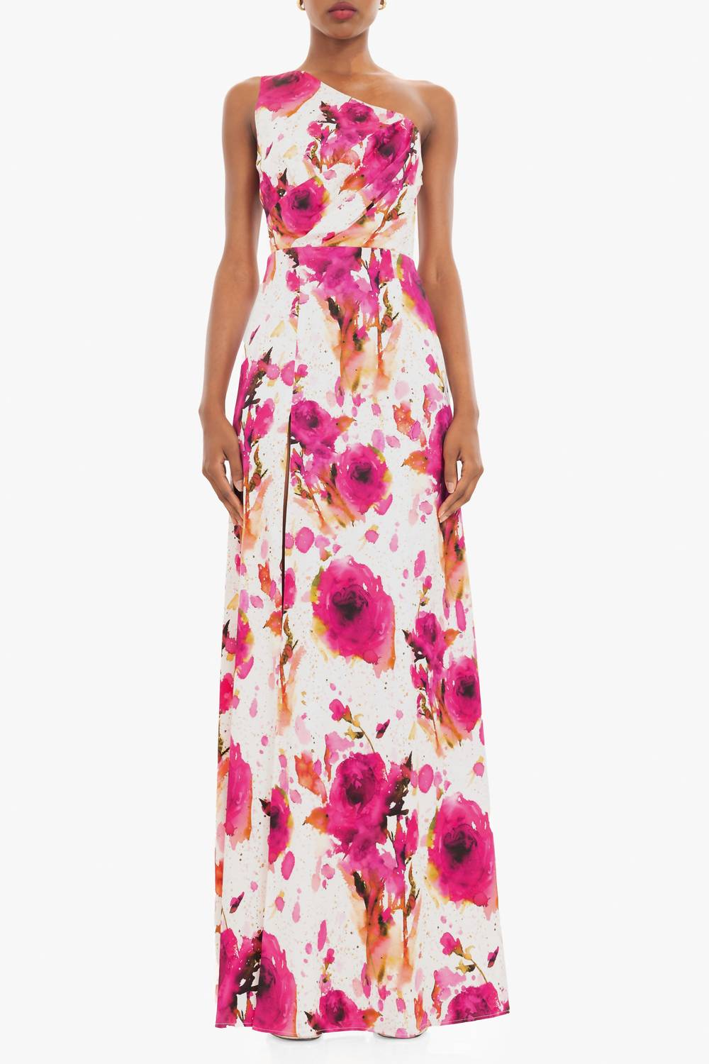 A maxi dress that is just as cute as it is comfortable. Step into elegance with the Marietta Floral Printed Gown by Black Halo, showcasing a sophisticated Floral Crush pattern. This sleeveless, floor-length design features a one-shoulder neckline and asymmetrical draping for a dynamic silhouette, complemented by a high slit on the wearer's right side. Crafted from a luxurious 97% viscose and 3% elastane satin with a polyamide lining, this gown offers both stretch and comfort. Originating from the USA with imported materials, it closes with a discreet side zipper and requires dry cleaning to maintain its pristine condition.