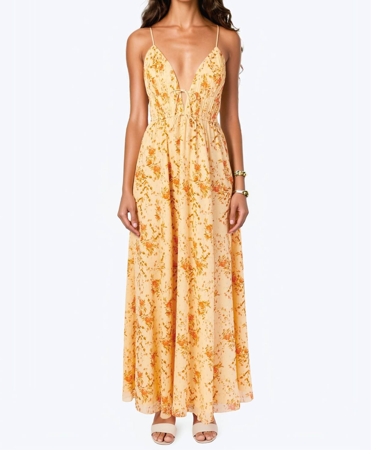 A maxi dress that is just as cute as it is comfortable. Introducing the Dorinda Crinkle Chiffon Maxi Dress by Cami NYC, a show-stopping piece in a shimmering Golden Hour hue perfect for your next holiday party. This sleeveless maxi dress is crafted from a luxurious metallic crinkle chiffon blend consisting of 55% Viscose, 40% Silk, and 5% Metallic, featuring a flattering fit and flare silhouette. Designed with criss-cross adjustable straps and elasticated underbust, it offers an elegant V-neckline and a side zipper with a hook and eye closure for a sleek finish. Care: Dry clean and steam only. Model is wearing size 0 and stands at 5'7".