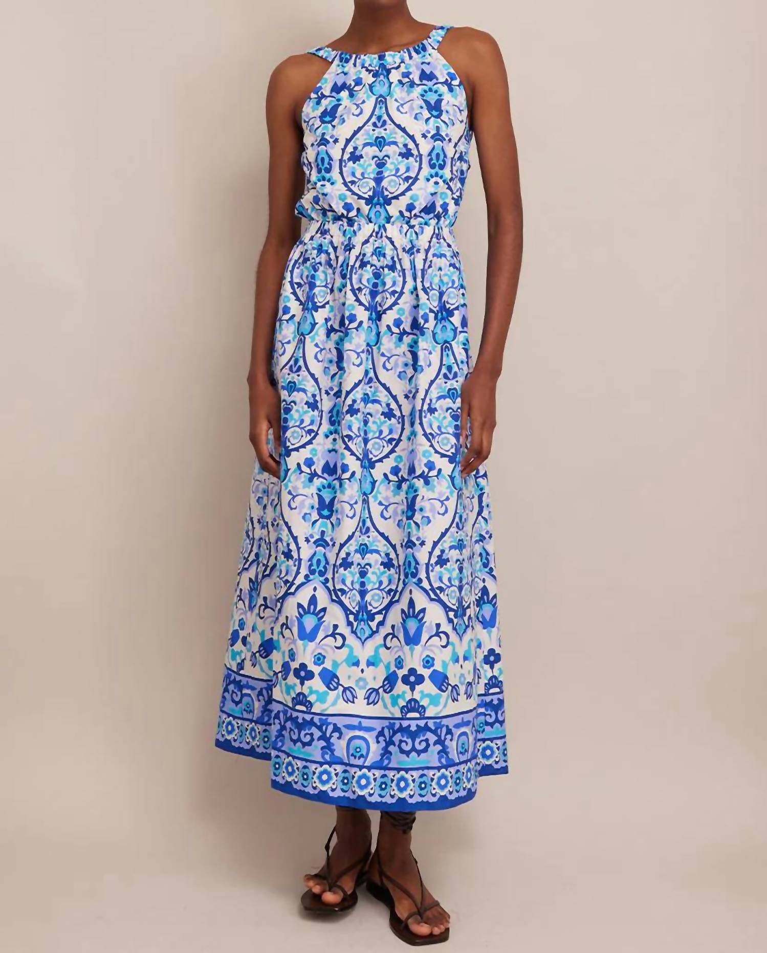 Elevate your summer wardrobe with the Colomba Maxi Dress by Cara Cara, a striking piece in Demask Blue. This sleeveless dress is crafted from 100% Cotton Poplin and features a modern geometric print, ideal for any vacation setting. Its A-line silhouette is complemented by a midi length, scoop neckline, elastic waistband, and bow tie open back for a chic, feminine look. Closure: Tie closure. Care: Dry clean only or hand wash cold.