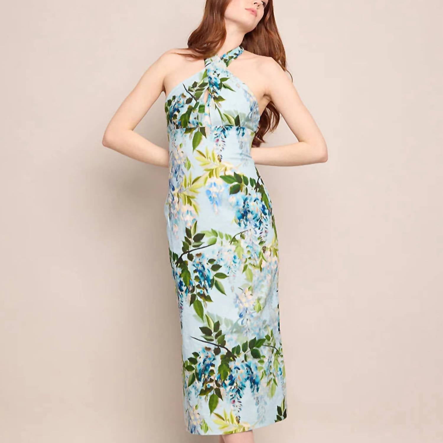 Introducing the Perla Midi Dress by Cara Cara, a stunning sheath silhouette in a light blue floral print perfect for celebrating special occasions. This sleeveless dress boasts a criss-cross halter neckline and an open back with a gracefully draped bodice, enhancing its sophisticated, fitted design. Expertly crafted from 100% Linen with a Cotton Voile lining, it features a center back zip closure with a hook-and-eye fastening for convenience. Made in China, this dress is designed with a center back vent for ease of movement, and it requires either dry cleaning or a cold hand wash to maintain its luxurious appeal.