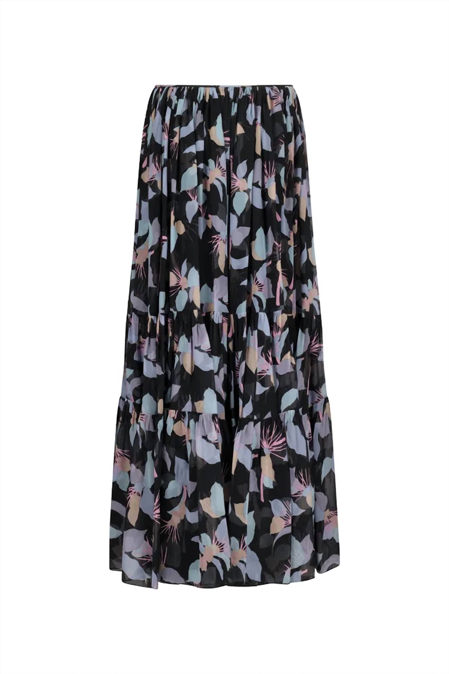 Introducing the Chloe Women's Gathered Maxi Skirt, an elegant addition to your summer wardrobe. Crafted from 100% silk, this black skirt showcases a delicate floral pattern that's perfect for vacation getaways. Featuring a pull-on closure with an elastic waist for comfort, it is made in Madagascar and ensures a luxurious feel. For best care, dry clean only.