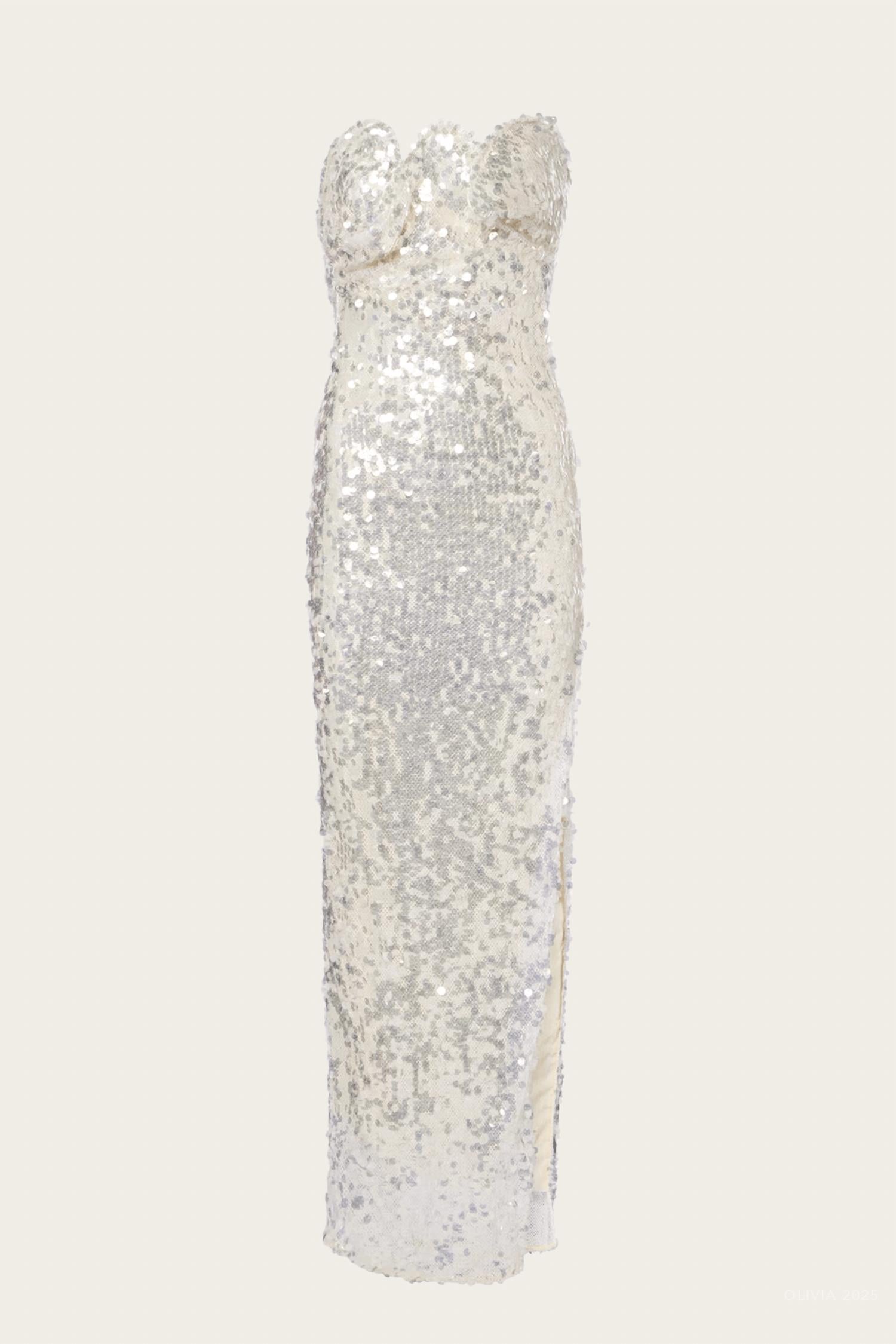 The pefect strapless dress for those warmer months. Add a cardigan for those cooler summer nights. The Opaline Sequin Strapless Gown by Christopher Esber is a stunning evening piece, designed in the captivating shade of Glisten Clear. This strapless gown is crafted with a sequin overlay composed of 100% polyester, while its base is made from 90% polyamide and 10% elastane, accented with silk straps. Made in China, it boasts a fitted, sheath silhouette with a stretchy fabric for a flattering fit. The gown secures with a back zip closure and requires dry cleaning to maintain its exquisite finish.