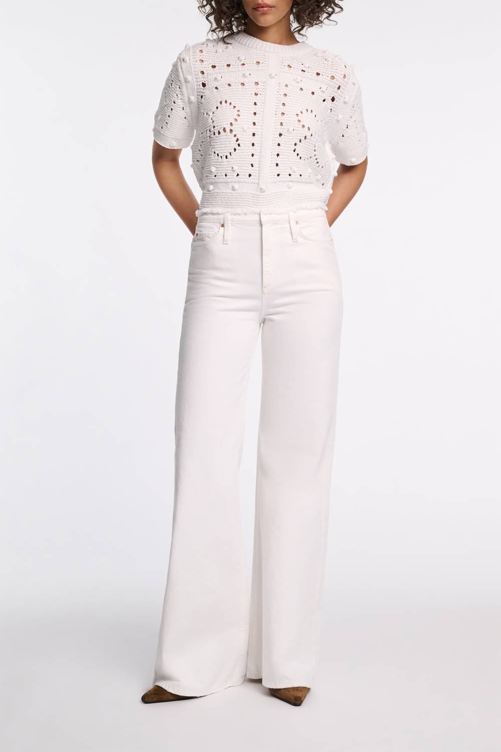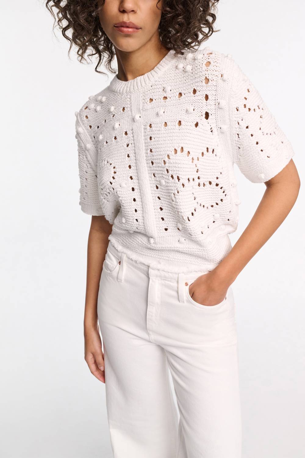 Embrace a laid-back elegance with the Bohemian Mood Pullover Sweater by Dorothee Schumacher, an exquisite addition to your preppy fall wardrobe. Crafted from 64% Cotton, 28% Lyocell, 8% Polyamide, this white top features a crewneck and elbow-length sleeves, enriched with stitch and D-rose pointelle texturing. It's designed with a pull-on closure for easy wear. Care instructions: Dry clean only.