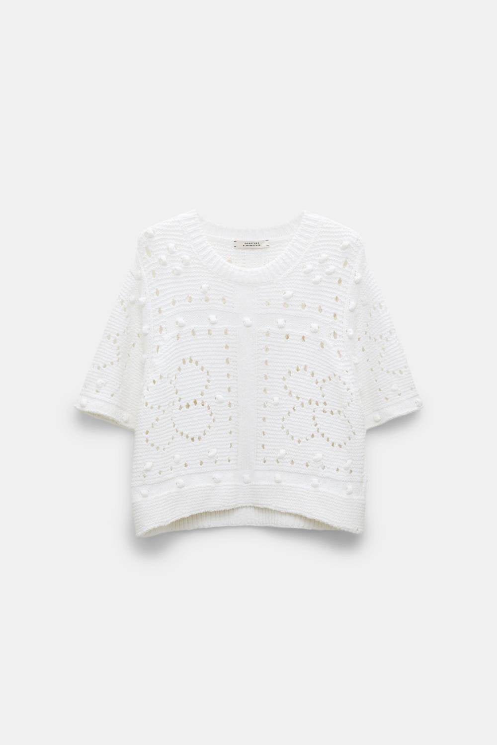 Stay warm and stylish in this versatile and effortlessly cool knitwear staple. Wear it alone or layered, it's the perfect sweater for the season and you'll wish you had it in every color. Embrace a laid-back elegance with the Bohemian Mood Pullover Sweater by Dorothee Schumacher, an exquisite addition to your preppy fall wardrobe. Crafted from 64% Cotton, 28% Lyocell, 8% Polyamide, this white top features a crewneck and elbow-length sleeves, enriched with stitch and D-rose pointelle texturing. It's designed with a pull-on closure for easy wear. Care instructions: Dry clean only.