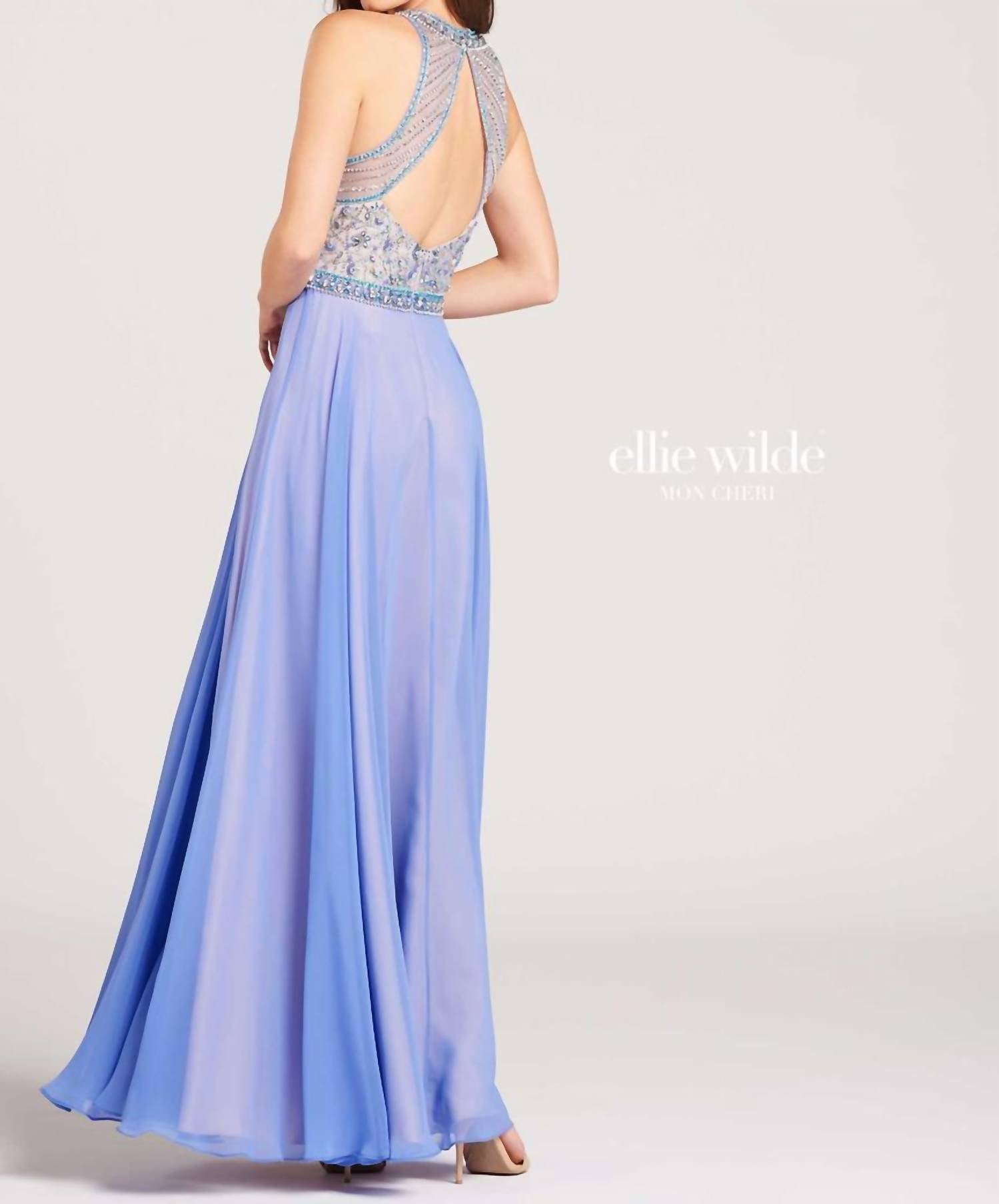 Looking for that perfect event dress? Look no further... Make a grand entrance with the Ellie Wilde Women's Prom Dress in a stunning periwinkle hue, perfect for the maximalist trend. This A-line dress is beautifully textured, featuring a chic halter neckline and a sleek sleeveless design. Closure: Zip closure. Ideal for spring prom occasions, this elegant dress ensures you shine on your special night.