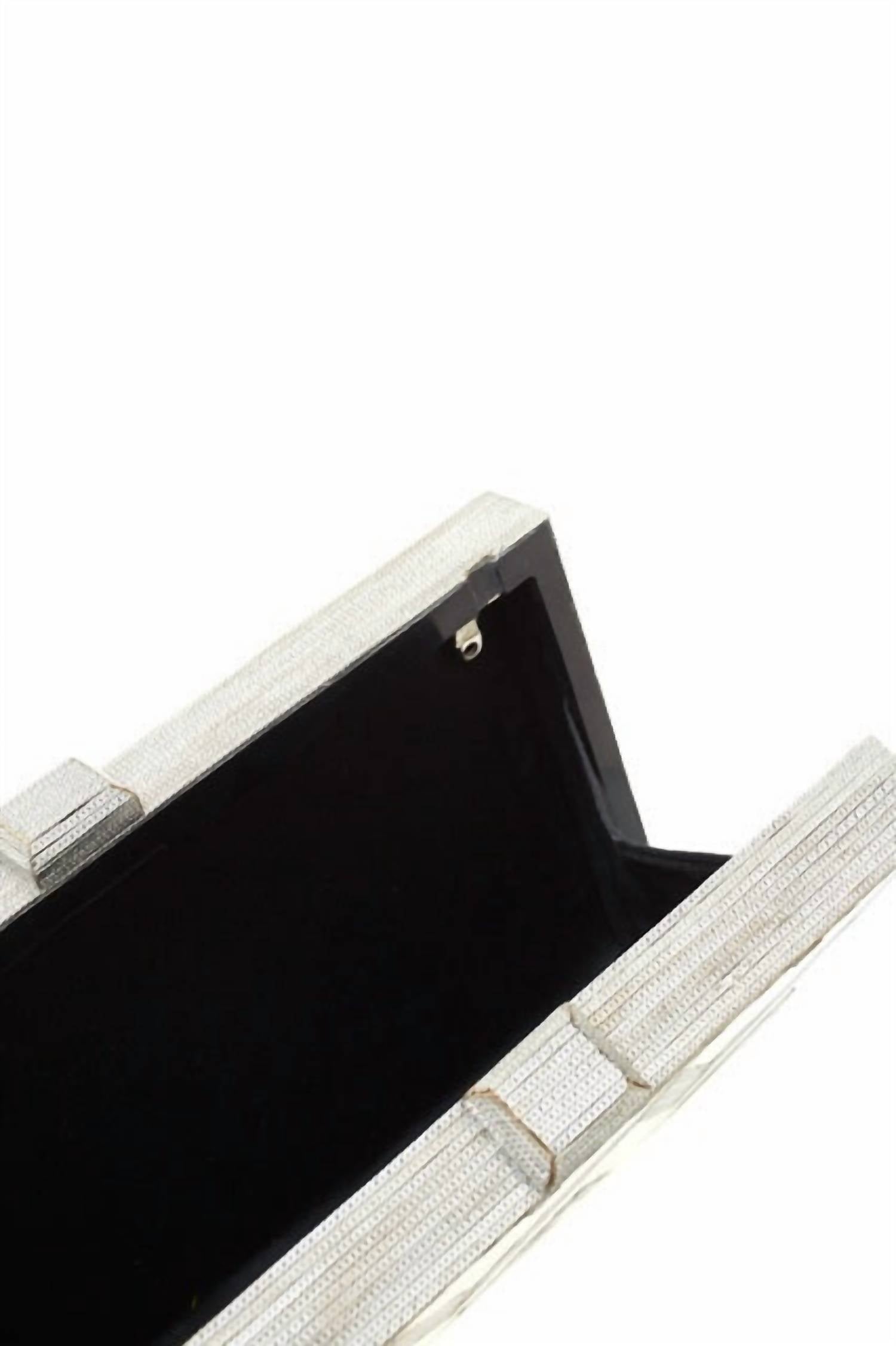 Introducing the Women's Ciggones Clutch Bag by Emm Kuo, a masterful blend of materials creating a timeless piece with a unique chevron design. This multi-colored clutch is intricately inlaid by hand with stainless steel, mother of pearl, silver chain, and embossed metallic leather. It features a detachable silver snakechain and a sophisticated black matte satin interior. Dimensions are 200mm x 110mm x 40mm, emphasizing its compact yet stylish design.